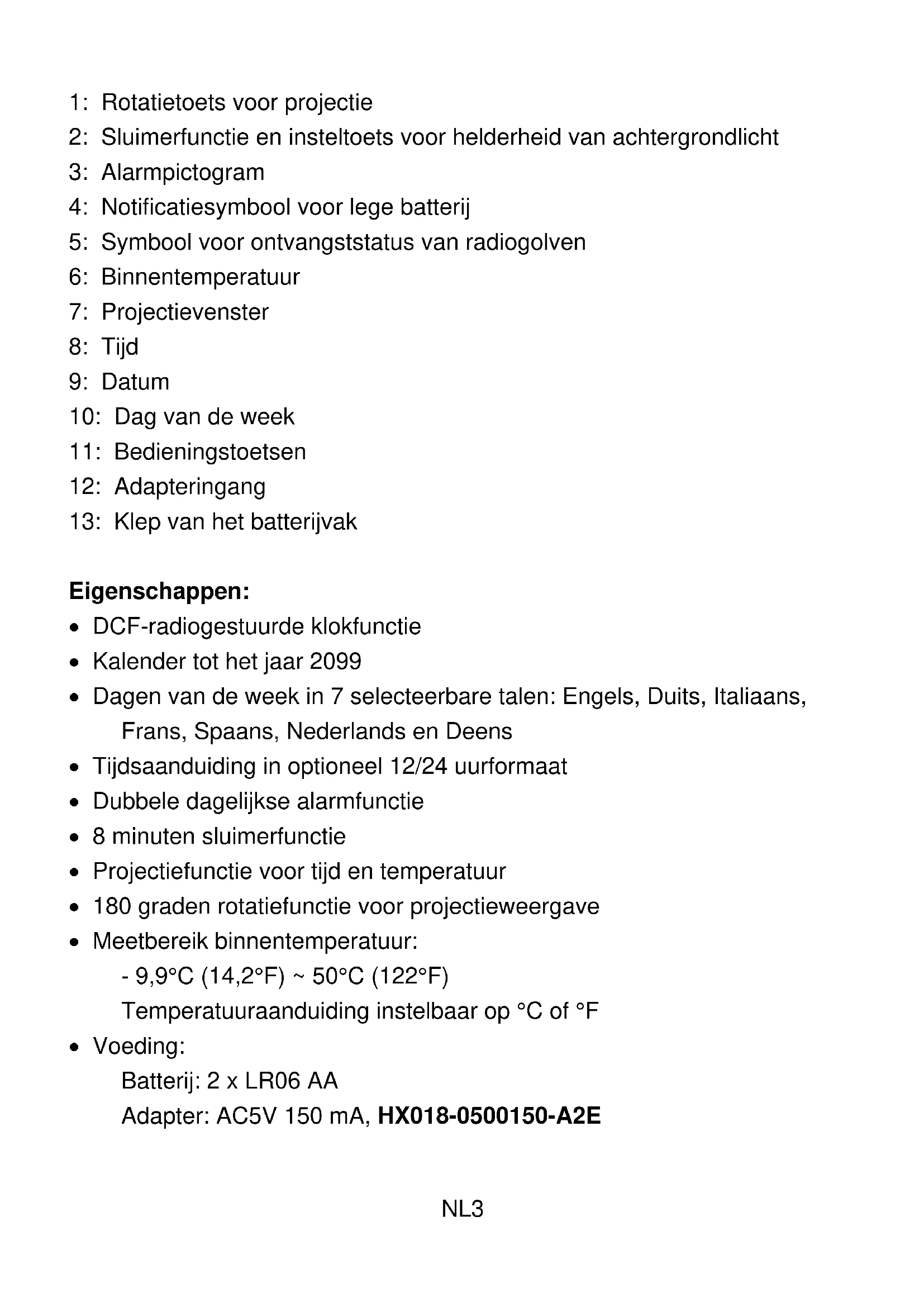 - Gebruik uitsluitend de meegeleverde adapter: HX018-0500150-A2E
