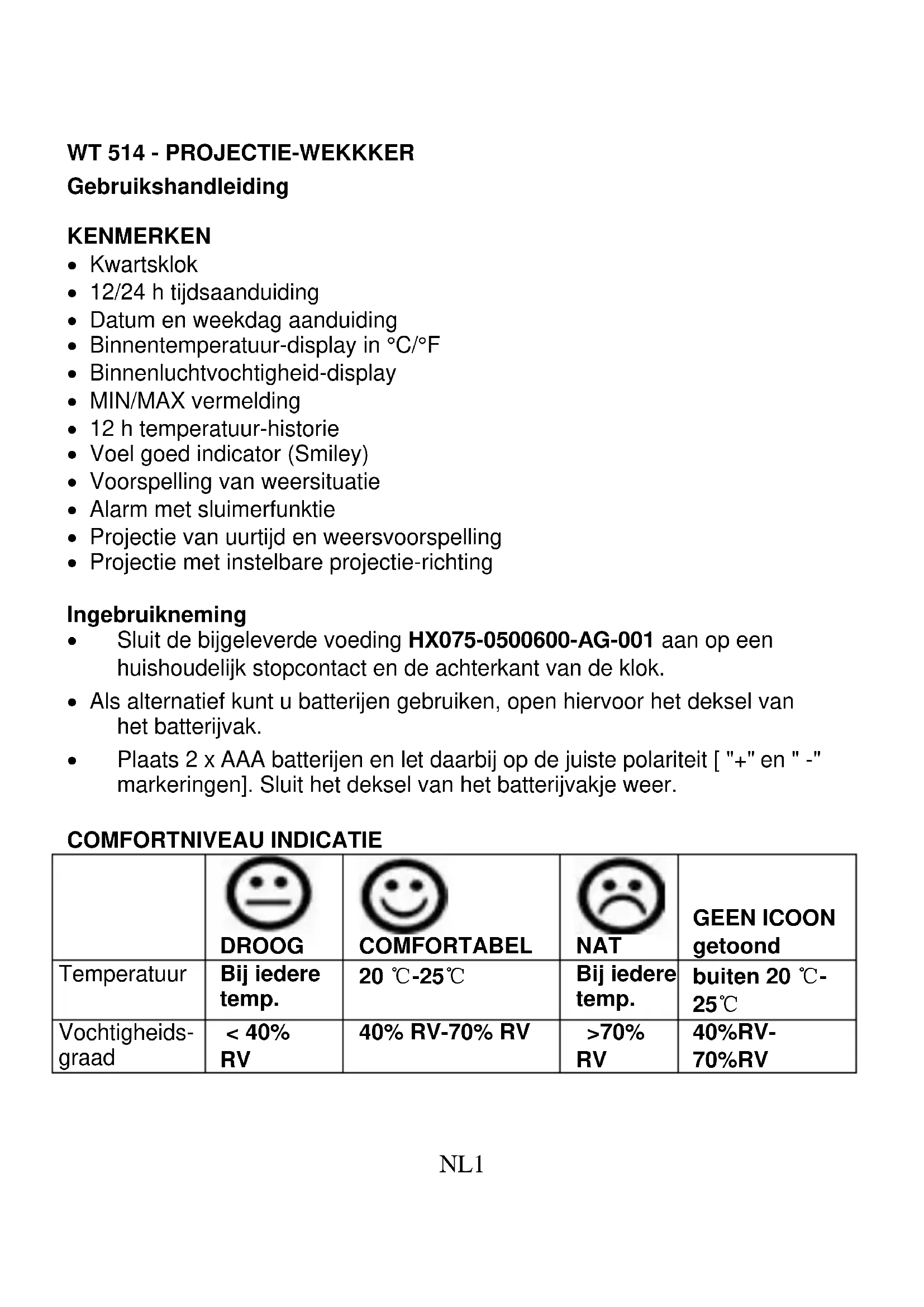 Gebruikshandleiding KENMERKEN Kwartsklok 12/24 h tijdsaanduiding Datum en weekdag aanduiding Binnentemperatuur-display in °C/°F Binnenluchtvochtigheid-display MIN/MAX vermelding 12 h temperatuur-historie Voel goed indicator (Smiley) Voorspelling van weersituatie Alarm met sluimerfunktie Projectie van uurtijd en weersvoorspelling Projectie met instelbare projectie-richting Ingebruikneming Sluit de bijgeleverde voeding HX075-0500600-AG-001 aan op een huishoudelijk stopcontact en de achterkant van de klok. Als alternatief kunt u batterijen gebruiken, open hiervoor het deksel van het batterijvak. Plaats 2 x AAA batterijen en let daarbij op de juiste polariteit [ "+" en " -" markeringen]. Sluit het deksel van het batterijvakje weer. COMFORTNIVEAU INDICATIE