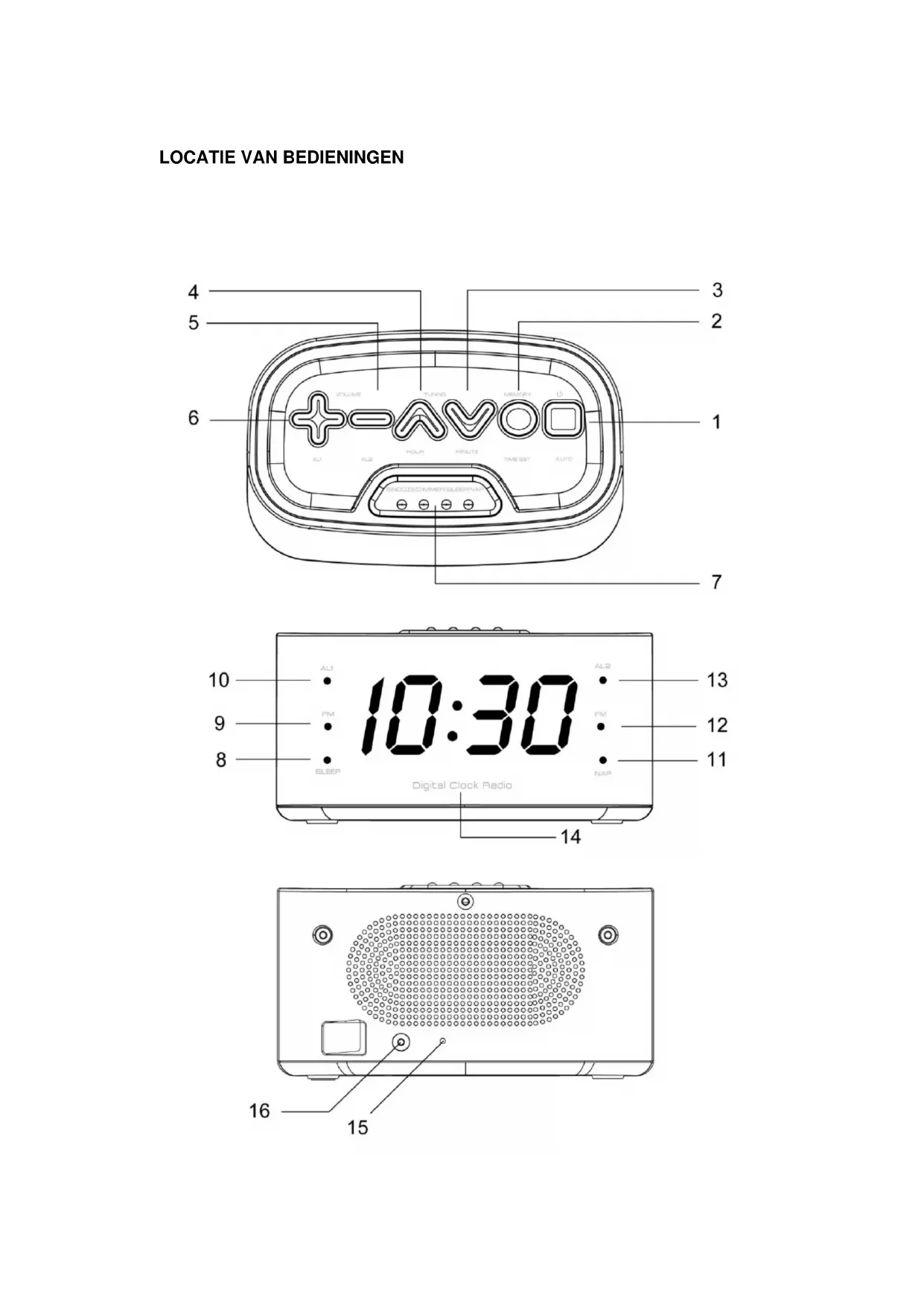 ONDERZIJDE VAN RADIO: Batterijhouder voor 2 x 1,5 volt (LR6, UM-3, AA) batterijen (niet inbegrepen) voor tijdelijk tijdbehoud.