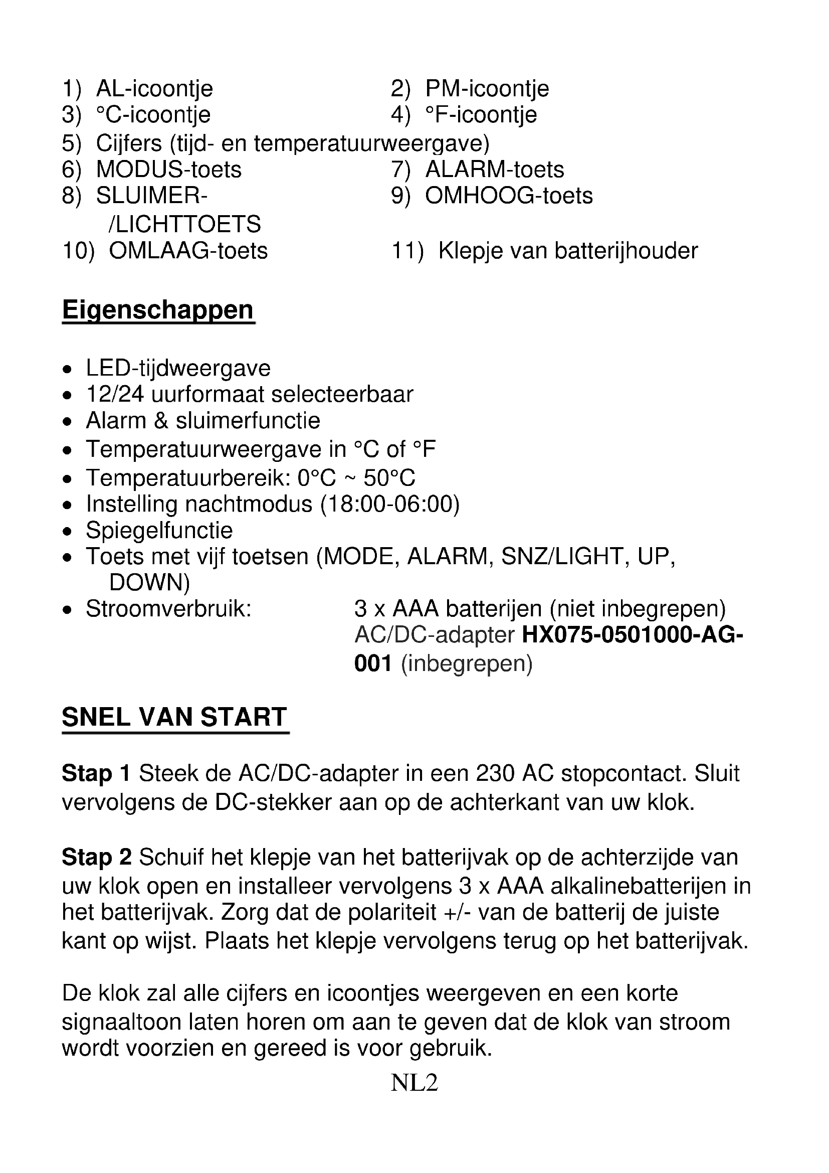 - Stroomverbruik: 3 x AAA batterijen (niet inbegrepen) AC/DC-adapter HX075-0501000-AG-001 (inbegrepen)