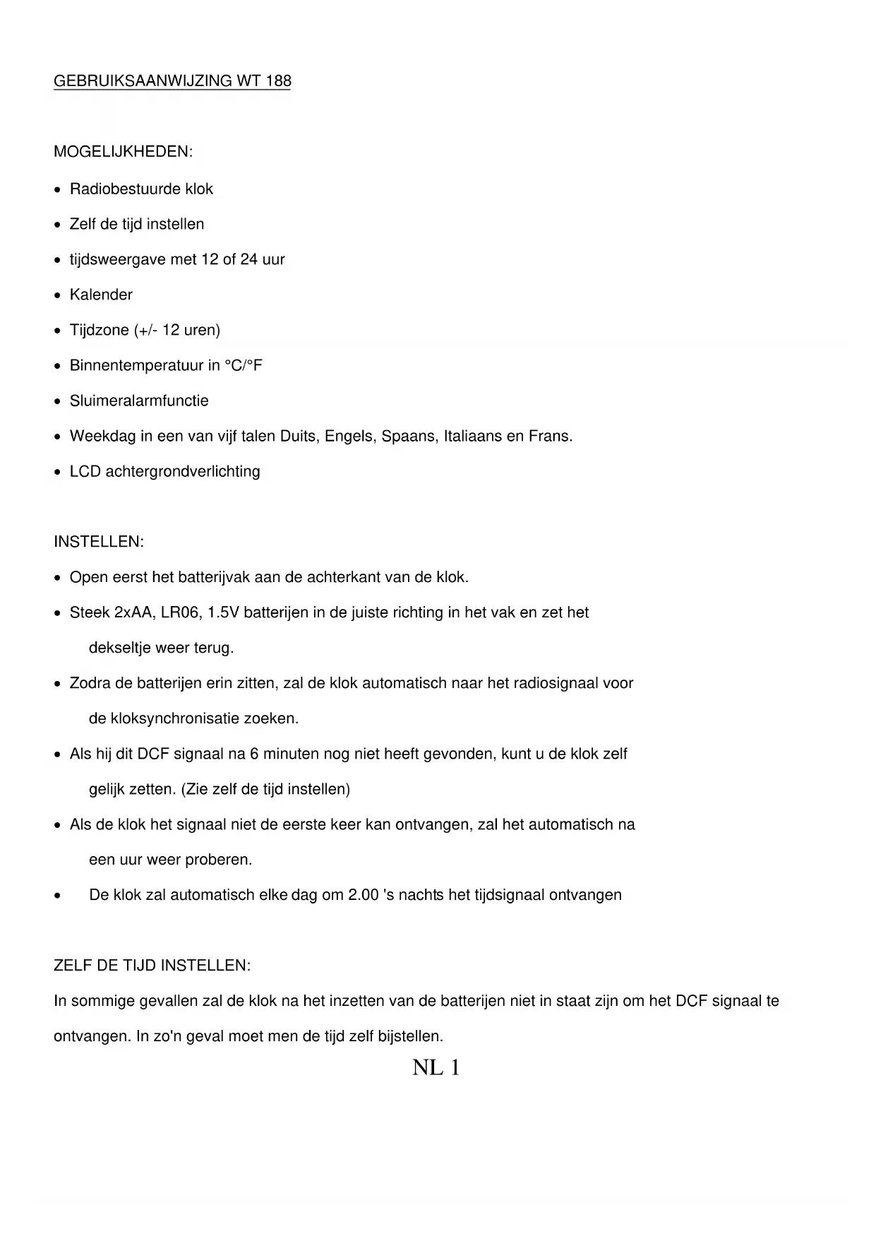 In sommige gevallen zal de klok na het inzetten van de batterijen niet in staat zijn om het DCF signaal te ontvangen. In zo'n geval moet men de tijd zelf bijstellen.