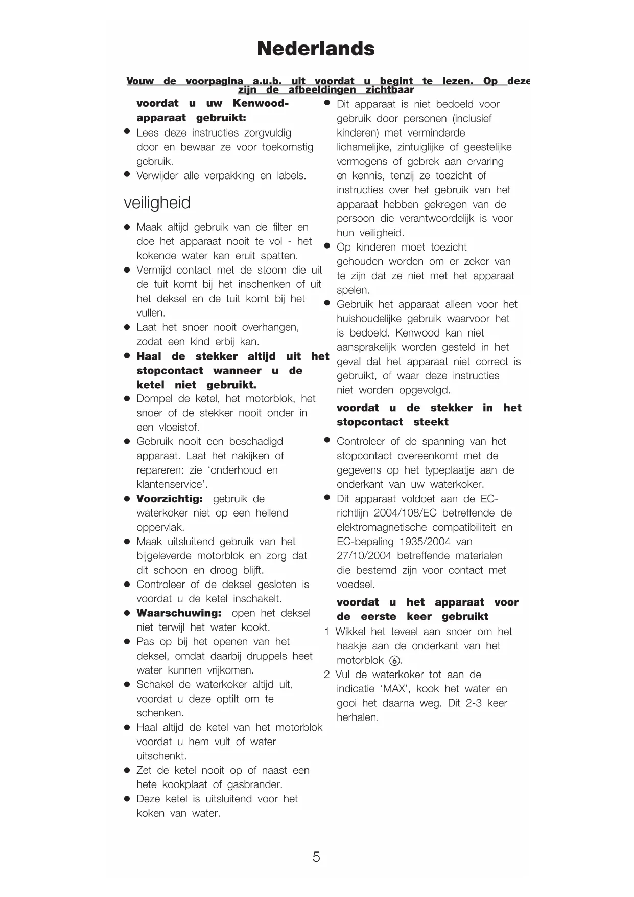 Gebruik het apparaat alleen voor het huishoudelijke gebruik waarvoor het is bedoeld. Kenwood kan niet aansprakelijk worden gesteld in het geval dat het apparaat niet correct is gebruikt, of waar deze instructies niet worden opgevolgd. voordat u de stekker in het stopcontact steekt