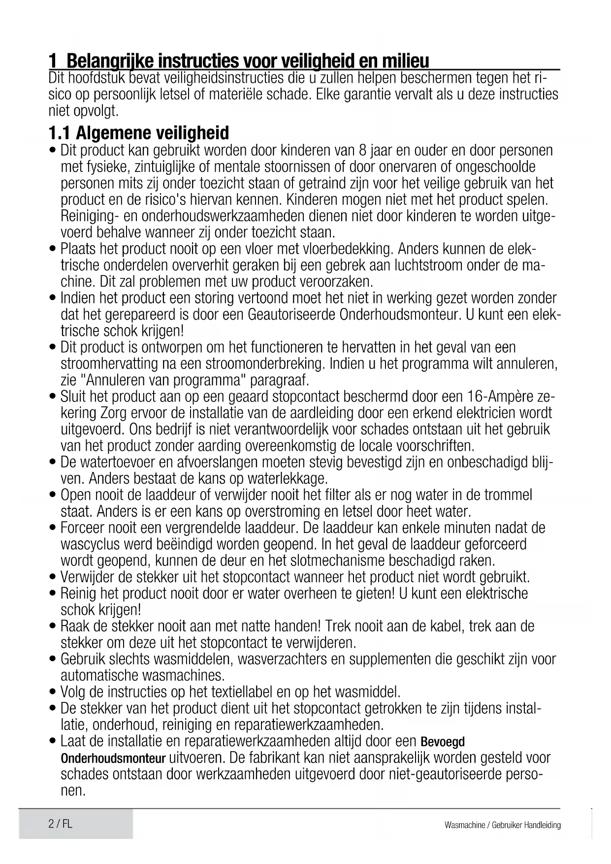 - Laat de installatie en reparatiewerkzaamheden altijd door een Bevoegd Onderhoudsmonteur uitvoeren. De fabrikant kan niet aansprakelijk worden gesteld voor schades ontstaan door werkzaamheden uitgevoerd door niet-geautoriseerde perso- nen.3 / FL Wasmachine / Gebruiker Handleiding