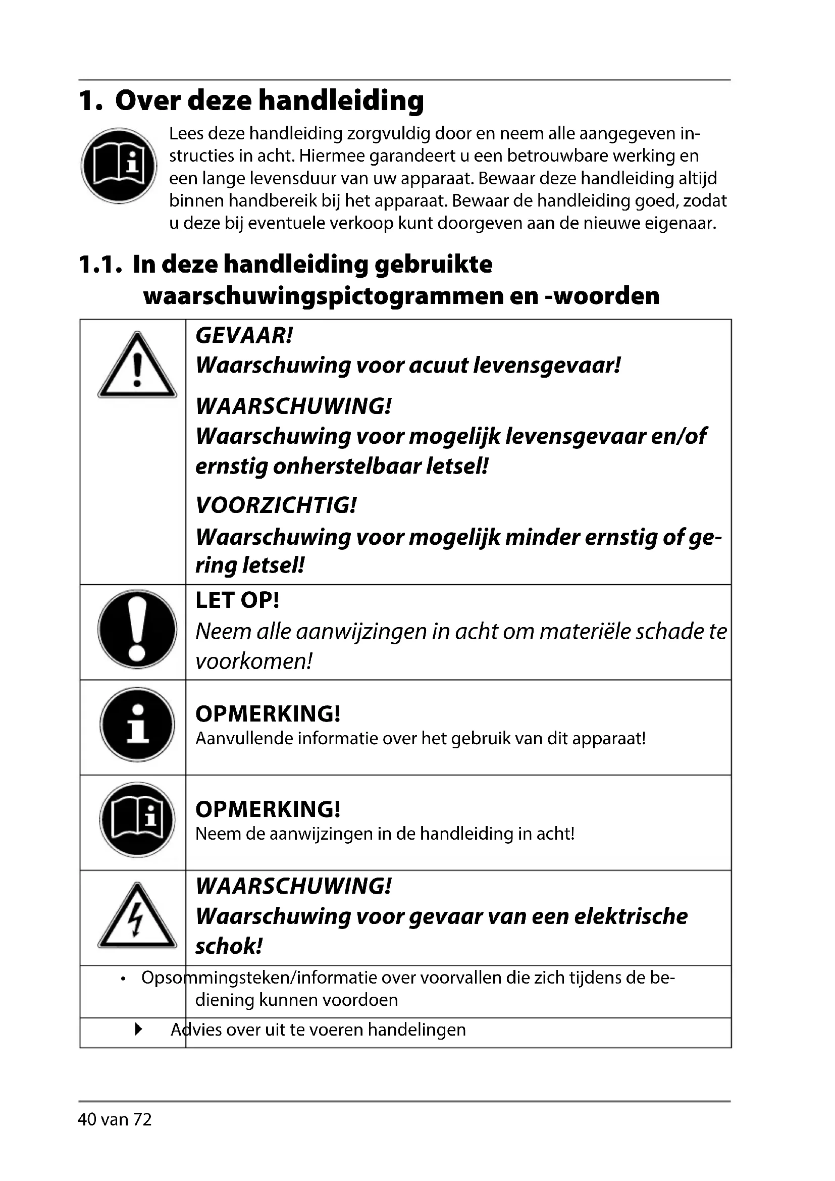 Lees deze handleiding zorgvuldig door en neem alle aangegeven in- structies in acht. Hiermee garandeert u een betrouwbare werking en een lange levensduur van uw apparaat. Bewaar deze handleiding altijd binnen handbereik bij het apparaat. Bewaar de handleiding goed, zodat u deze bij eventuele verkoop kunt doorgeven aan de nieuwe eigenaar. 1.1. In deze handleiding gebruikte waarschuwingspictogrammen en -woorden GEVAAR! Waarschuwing voor acuut levensgevaar! WAARSCHUWING! Waarschuwing voor mogelijk levensgevaar en/of ernstig onherstelbaar letsel! VOORZICHTIG! Waarschuwing voor mogelijk minder ernstig of ge- ring letsel! LET OP! Neem alle aanwijzingen in acht om materiële schade te voorkomen! OPMERKING! Aanvullende informatie over het gebruik van dit apparaat! OPMERKING! Neem de aanwijzingen in de handleiding in acht! WAARSCHUWING! Waarschuwing voor gevaar van een elektrische schok!