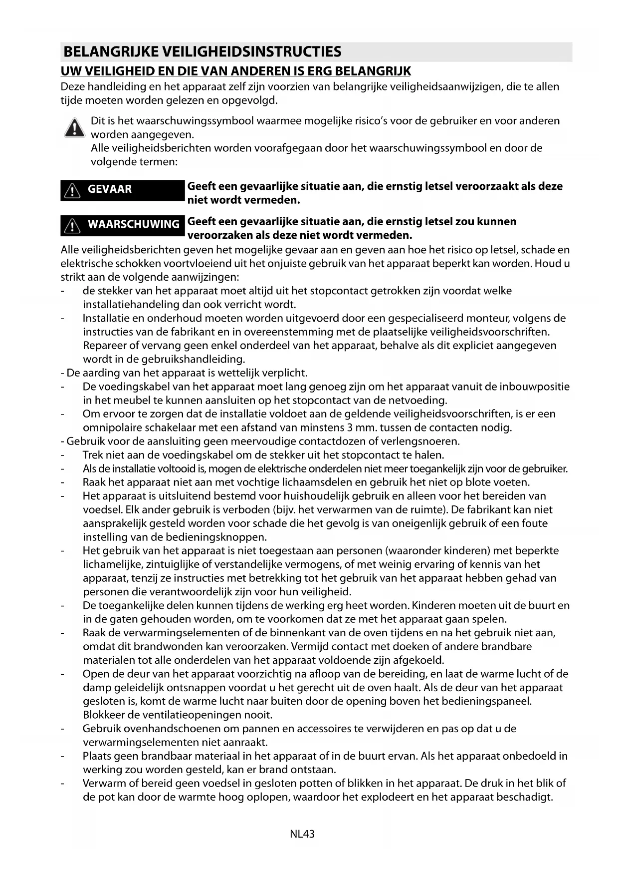 UW VEILIGHEID EN DIE VAN ANDEREN IS ERG BELANGRIJK Deze handleiding en het apparaat zelf zijn voorzien van belangrijke veiligheidsaanwijzigen, die te allen tijde moeten worden gelezen en opgevolgd. Alle veiligheidsberichten geven het mogelijke gevaar aan en geven aan hoe het risico op letsel, schade en elektrische schokken voortvloeiend uit het onjuiste gebruik van het apparaat beperkt kan worden. Houd u strikt aan de volgende aanwijzingen: - de stekker van het apparaat moet altijd uit het stopcontact getrokken zijn voordat welke installatiehandeling dan ook verricht wordt. - Installatie en onderhoud moeten worden uitgevoerd door een gespecialiseerd monteur, volgens de instructies van de fabrikant en in overeenstemming met de plaatselijke veiligheidsvoorschriften. Repareer of vervang geen enkel onderdeel van het apparaat, behalve als dit expliciet aangegeven wordt in de gebruikshandleiding. - De aarding van het apparaat is wettelijk verplicht. - De voedingskabel van het apparaat moet lang genoeg zijn om het apparaat vanuit de inbouwpositie in het meubel te kunnen aansluiten op het stopcontact van de netvoeding. - Om ervoor te zorgen dat de installatie voldoet aan de geldende veiligheidsvoorschriften, is er een omnipolaire schakelaar met een afstand van minstens 3 mm. tussen de contacten nodig. - Gebruik voor de aansluiting geen meervoudige contactdozen of verlengsnoeren. - Trek niet aan de voedingskabel om de stekker uit het stopcontact te halen. - Als de installatie voltooid is, mogen de elektrische onderdelen niet meer toegankelijk zijn voor de gebruiker. - Raak het apparaat niet aan met vochtige lichaamsdelen en gebruik het niet op blote voeten. - Het apparaat is uitsluitend bestemd voor huishoudelijk gebruik en alleen voor het bereiden van voedsel. Elk ander gebruik is verboden (bijv. het verwarmen van de ruimte). De fabrikant kan niet aansprakelijk gesteld worden voor schade die het gevolg is van oneigenlijk gebruik of een foute instelling van de bedieningsknoppen. - Het gebruik van het apparaat is niet toegestaan aan personen (waaronder kinderen) met beperkte lichamelijke, zintuiglijke of verstandelijke vermogens, of met weinig ervaring of kennis van het apparaat, tenzij ze instructies met betrekking tot het gebruik van het apparaat hebben gehad van personen die verantwoordelijk zijn voor hun veiligheid. - De toegankelijke delen kunnen tijdens de werking erg heet worden. Kinderen moeten uit de buurt en in de gaten gehouden worden, om te voorkomen dat ze met het apparaat gaan spelen. - Raak de verwarmingselementen of de binnenkant van de oven tijdens en na het gebruik niet aan, omdat dit brandwonden kan veroorzaken. Vermijd contact met doeken of andere brandbare materialen tot alle onderdelen van het apparaat voldoende zijn afgekoeld. - Open de deur van het apparaat voorzichtig na afloop van de bereiding, en laat de warme lucht of de damp geleidelijk ontsnappen voordat u het gerecht uit de oven haalt. Als de deur van het apparaat gesloten is, komt de warme lucht naar buiten door de opening boven het bedieningspaneel. Blokkeer de ventilatieopeningen nooit. - Gebruik ovenhandschoenen om pannen en accessoires te verwijderen en pas op dat u de verwarmingselementen niet aanraakt. - Plaats geen brandbaar materiaal in het apparaat of in de buurt ervan. Als het apparaat onbedoeld in werking zou worden gesteld, kan er brand ontstaan. - Verwarm of bereid geen voedsel in gesloten potten of blikken in het apparaat. De druk in het blik of de pot kan door de warmte hoog oplopen, waardoor het explodeert en het apparaat beschadigt. BELANGRIJKE VEILIGHEIDSINSTRUCTIES Dit is het waarschuwingssymbool waarmee mogelijke risico’s voor de gebruiker en voor anderen worden aangegeven. Alle veiligheidsberichten worden voorafgegaan door het waarschuwingssymbool en door de volgende termen: GEVAAR Geeft een gevaarlijke situatie aan, die ernstig letsel veroorzaakt als deze niet wordt vermeden. WAARSCHUWING Geeft een gevaarlijke situatie aan, die ernstig letsel zou kunnen veroorzaken als deze niet wordt vermeden.NL44 - Gebruik geen schalen of houders van synthetisch materiaal. - Oververhitte vetten en olie kunnen makkelijk vlam vatten. Houd de bereiding van gerechten met veel vet of olie in de gaten. - Laat het apparaat nooit onbewaakt achter tijdens het droogproces van gerechten. - Als u voor het roosteren van vlees, of bakken van taarten alcoholische dranken toevoegt (bijv. rum, cognac, wijn) moet u er rekening mee houden dat alcohol bij hoge temperaturen verdampt. De alcoholdamp kan vlam vatten wanneer deze in contact komt met het elektrische verwarmingselement. Afvalverwerking van huishoudelijke apparaten - Dit product is vervaardigd van materiaal dat gerecycled of opnieuw gebruikt kan worden. Afdanken moet plaatsvinden in overeenstemming met de plaatselijke milieuvoorschriften voor afvalverwerking. Voordat u het apparaat afdankt moet de voedingskabel worden afgesneden, zodat het apparaat onbruikbaar wordt. - Voor meer informatie over behandeling, terugwinning en recycling van huishoudelijke apparaten kunt u contact opnemen met uw plaatselijke instantie, de vuilnisophaaldienst of de winkel waar u dit product hebt gekocht. Controleer na het uitpakken van de oven of het apparaat tijdens het transport geen beschadigingen heeft opgelopen en of de ovendeur goed sluit. Neem in geval van twijfel contact op met uw leverancier of de klantenservice. Om eventuele schade te voorkomen wordt geadviseerd om de oven pas voor de installatie van de piepschuim bodem te halen.
