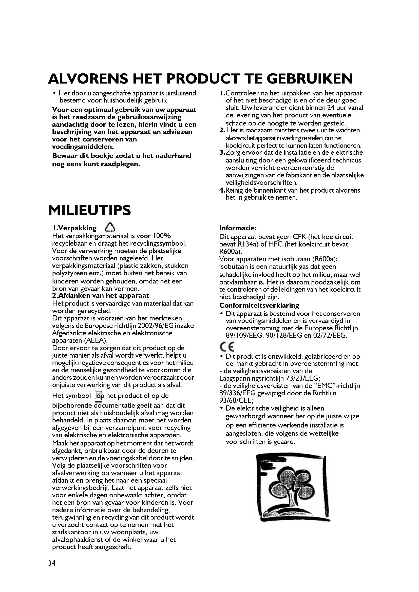 alvorens het apparaat in werking te stellen, om het koelcircuit perfect te kunnen laten functioneren. 3.Zorg ervoor dat de installatie en de elektrische aansluiting door een gekwalificeerd technicus worden verricht overeenkomstig de aanwijzingen van de fabrikant en de plaatselijke veiligheidsvoorschriften. 4.Reinig de binnenkant van het product alvorens het in gebruik te nemen. 1.Verpakking Het verpakkingsmateriaal is voor 100% recyclebaar en draagt het recyclingssymbool. Voor de verwerking moeten de plaatselijke voorschriften worden nageleefd. Het verpakkingsmateriaal (plastic zakken, stukken polystyreen enz.) moet buiten het bereik van kinderen worden gehouden, omdat het een bron van gevaar kan vormen. 2.Afdanken van het apparaat Het product is vervaardigd van materiaal dat kan worden gerecycled. Dit apparaat is voorzien van het merkteken volgens de Europese richtlijn 2002/96/EG inzake Afgedankte elektrische en elektronische apparaten (AEEA). Door ervoor te zorgen dat dit product op de juiste manier als afval wordt verwerkt, helpt u mogelijk negatieve consequenties voor het milieu en de menselijke gezondheid te voorkomen die anders zouden kunnen worden veroorzaakt door onjuiste verwerking van dit product als afval. Het symbool op het product of op de bijbehorende documentatie geeft aan dat dit product niet als huishoudelijk afval mag worden behandeld. In plaats daarvan moet het worden afgegeven bij een verzamelpunt voor recycling van elektrische en elektronische apparaten. Maak het apparaat op het moment dat het wordt afgedankt, onbruikbaar door de deuren te verwijderen en de voedingskabel door te snijden. Volg de plaatselijke voorschriften voor afvalverwerking op wanneer u het apparaat afdankt en breng het naar een speciaal verwerkingsbedrijf. Laat het apparaat zelfs niet voor enkele dagen onbewaakt achter, omdat het een bron van gevaar voor kinderen is. Voor nadere informatie over de behandeling, terugwinning en recycling van dit product wordt u verzocht contact op te nemen met het stadskantoor in uw woonplaats, uw afvalophaaldienst of de winkel waar u het product heeft aangeschaft. Informatie: Dit apparaat bevat geen CFK (het koelcircuit bevat R134a) of HFC (het koelcircuit bevat R600a). Voor apparaten met isobutaan (R600a): isobutaan is een natuurlijk gas dat geen schadelijke invloed heeft op het milieu, maar wel ontvlambaar is. Het is daarom noodzakelijk om te controleren of de leidingen van het koelcircuit niet beschadigd zijn. Conformiteitsverklaring