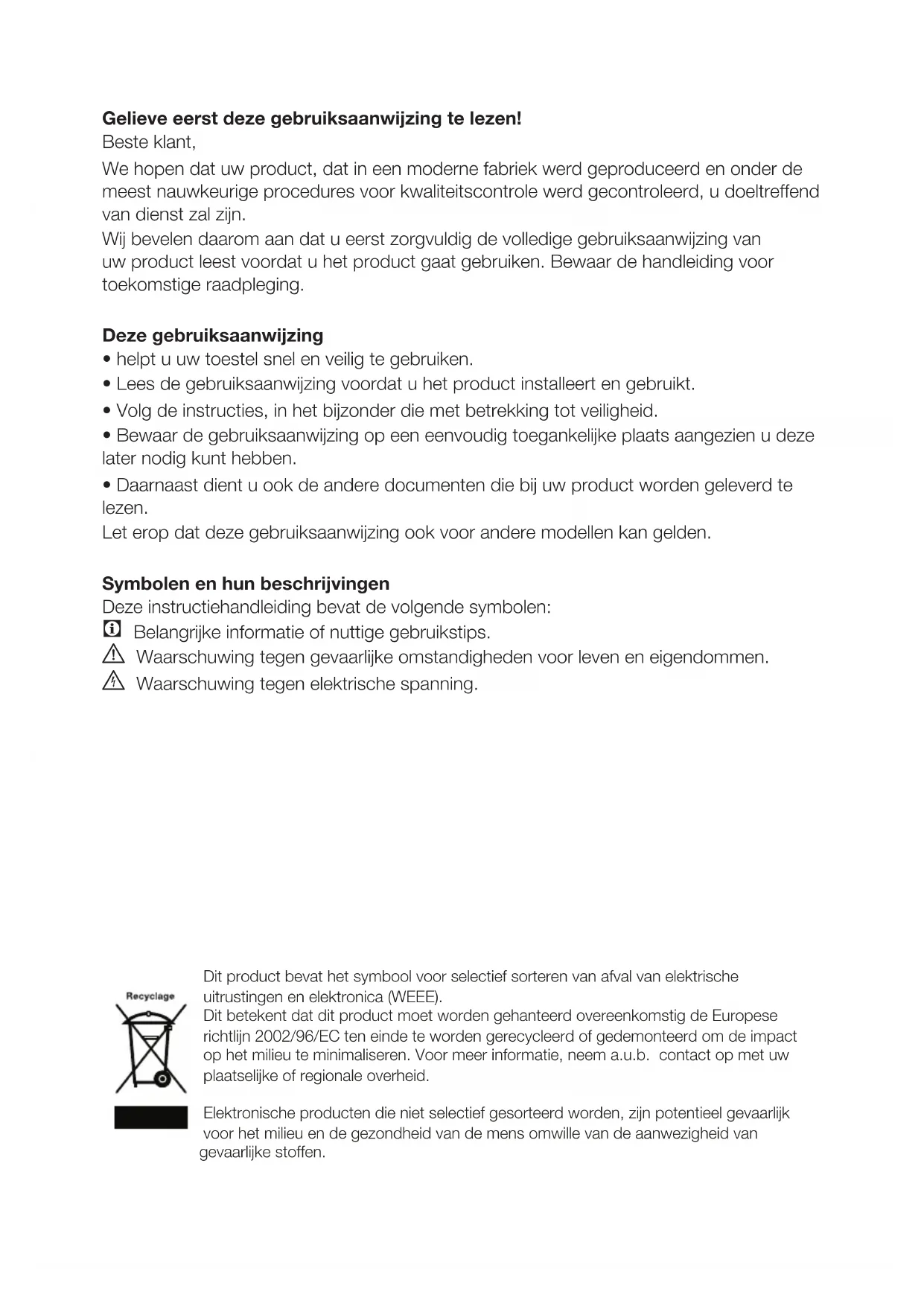 - Bewaar de gebruiksaanwijzing op een eenvoudig toegankelijke plaats aangezien u deze later nodig kunt hebben.