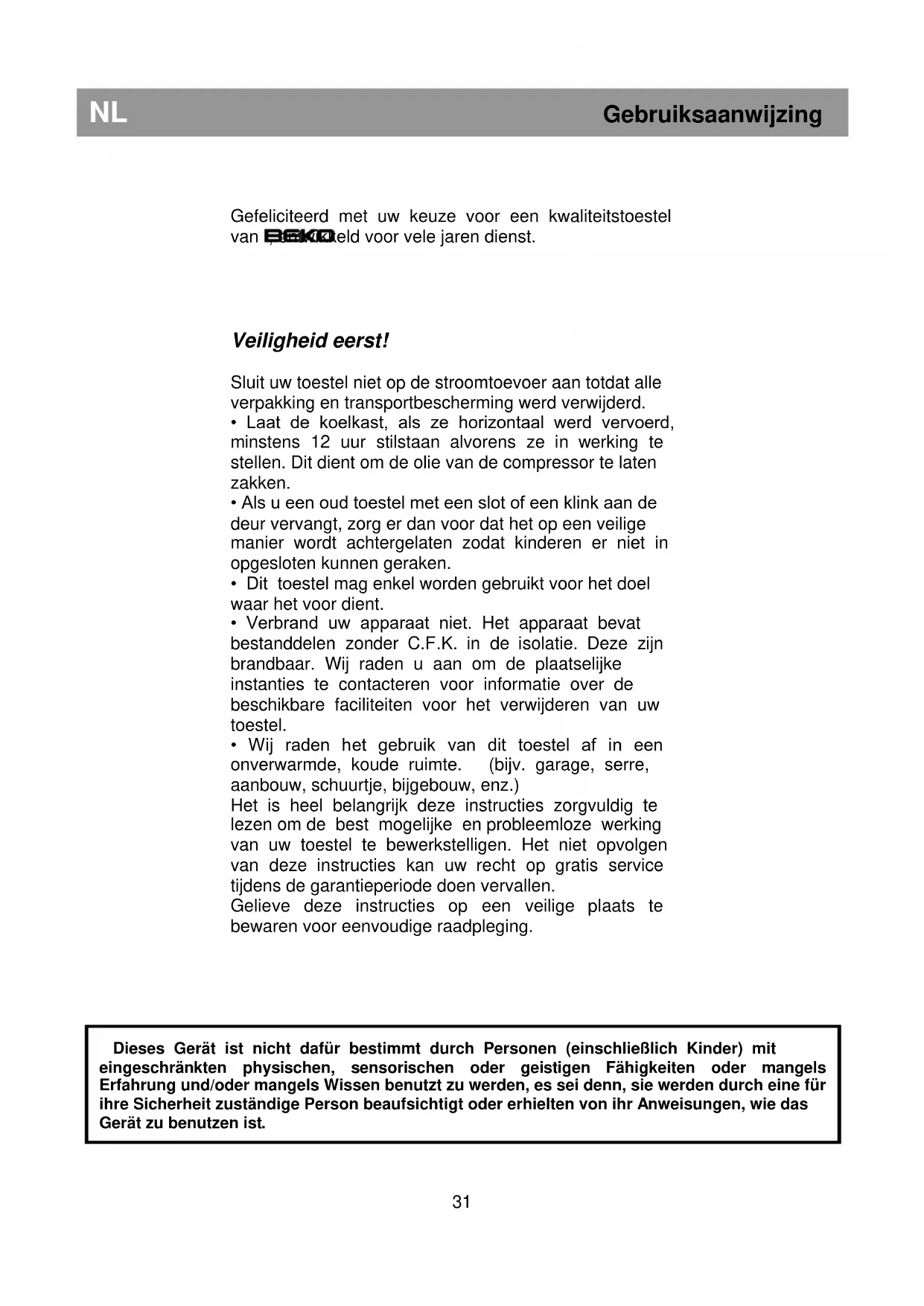 Dieses Gerät ist nicht dafür bestimmt durch Personen (einschließlich Kinder) mit eingeschränkten physischen, sensorischen oder geistigen Fähigkeiten oder mangels Erfahrung und/oder mangels Wissen benutzt zu werden, es sei denn, sie werden durch eine für ihre Sicherheit zuständige Person beaufsichtigt oder erhielten von ihr Anweisungen, wie das Gerät zu benutzen ist.NL Gebruiksaanwijzing Elektriciteitsvereisten Vergewis u ervan, alvorens u de stekker in het stopcontact steekt, dat de voltage en de frequentie op de kwalificatieplaat binnenin het toestel overeenkomen met uw stroomtoevoer. Wij raden u aan dit toestel aan te sluiten op de hoofdtoevoer via een naar behoren aangesloten en verzekerd stopcontact op een onmiddellijk bereikbare plaats. Waarschuwing! Dit toestel moet worden geaard. Herstellingen aan de elektrische uitrusting mogen enkel door een gekwalificeerde technicus worden uitgevoerd. Foutieve herstellingen, die werden uitgevoerd door een ongekwalificeerde persoon, houden risico’s in die kritieke gevolgen kunnen hebben voor de gebruiker van het toestel. OPGELET! Dit toestel werkt op R600a. Dit is een milieuvriendelijk, maar brandbaar gas. Tijdens het transport en de plaatsing van het product moet er zorg voor worden gedragen dat het koelsysteem niet wordt beschadigd. Als het koelsysteem toch wordt beschadigd en er ontstaat een gaslek, houd het product dan verwijderd van open vuurbronnen en verlucht de kamer een tijdje. WAARSCHUWING - Gebruik geen andere mechanische toestellen of andere middelen om het ontdooiingproces te versnellen dan die toestellen of middelen die door de fabrikant worden aangeraden. WAARSCHUWING - Beschadig het koelcircuit niet. WAARSCHUWING - Gebruik geen elektrische toestellen in de bewaarladen van het toestel, tenzij ze door de fabrikant worden aangeraden. WAARSCHUWING - Indien het netsnoer beschadigd is, moet dit door de producent, de dealer of een ander gekwalificeerd persoon worden gerepareerd om gevaar te voorkomen. Transportinstructies