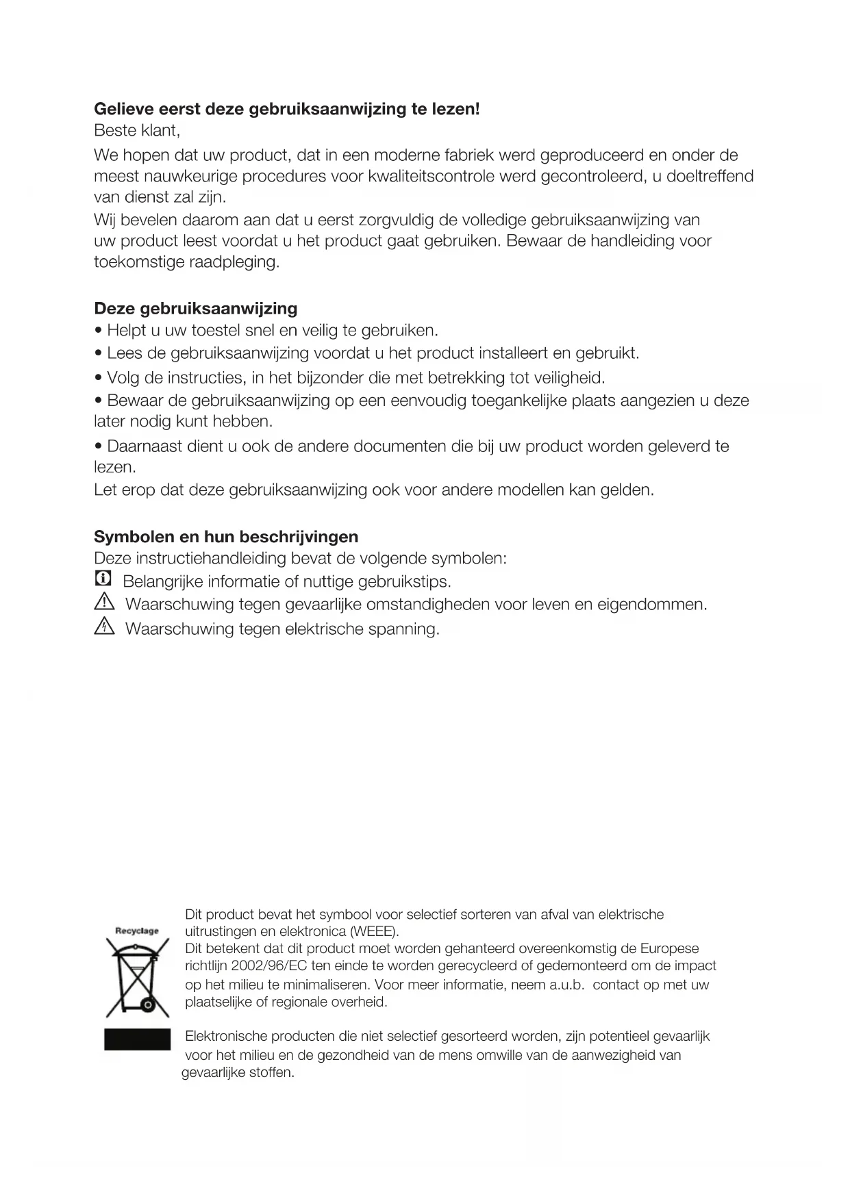 - Daarnaast dient u ook de andere documenten die bij uw product worden geleverd te lezen. Let erop dat deze gebruiksaanwijzing ook voor andere modellen kan gelden. Symbolen en hun beschrijvingen Deze instructiehandleiding bevat de volgende symbolen: C Belangrijke informatie of nuttige gebruikstips. A Waarschuwing tegen gevaarlijke omstandigheden voor leven en eigendommen. B Waarschuwing tegen elektrische spanning. Dit product bevat het symbool voor selectief sorteren van afval van elektrische uitrustingen en elektronica (WEEE). Dit betekent dat dit product moet worden gehanteerd overeenkomstig de Europese richtlijn 2002/96/EC ten einde te worden gerecycleerd of gedemonteerd om de impact op het milieu te minimaliseren. Voor meer informatie, neem a.u.b. contact op met uw plaatselijke of regionale overheid. Elektronische producten die niet selectief gesorteerd worden, zijn potentieel gevaarlijk voor het milieu en de gezondheid van de mens omwille van de aanwezigheid van gevaarlijke stoffen.NL