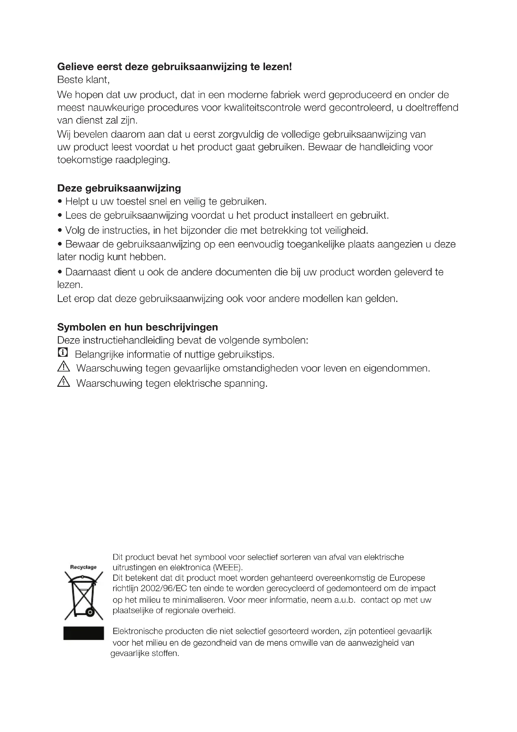- Daarnaast dient u ook de andere documenten die bij uw product worden geleverd te lezen. Let erop dat deze gebruiksaanwijzing ook voor andere modellen kan gelden. Symbolen en hun beschrijvingen Deze instructiehandleiding bevat de volgende symbolen: C Belangrijke informatie of nuttige gebruikstips. A Waarschuwing tegen gevaarlijke omstandigheden voor leven en eigendommen. B Waarschuwing tegen elektrische spanning. Dit product bevat het symbool voor selectief sorteren van afval van elektrische uitrustingen en elektronica (WEEE). Dit betekent dat dit product moet worden gehanteerd overeenkomstig de Europese richtlijn 2002/96/EC ten einde te worden gerecycleerd of gedemonteerd om de impact op het milieu te minimaliseren. Voor meer informatie, neem a.u.b. contact op met uw plaatselijke of regionale overheid. Elektronische producten die niet selectief gesorteerd worden, zijn potentieel gevaarlijk voor het milieu en de gezondheid van de mens omwille van de aanwezigheid van gevaarlijke stoffen.NL
