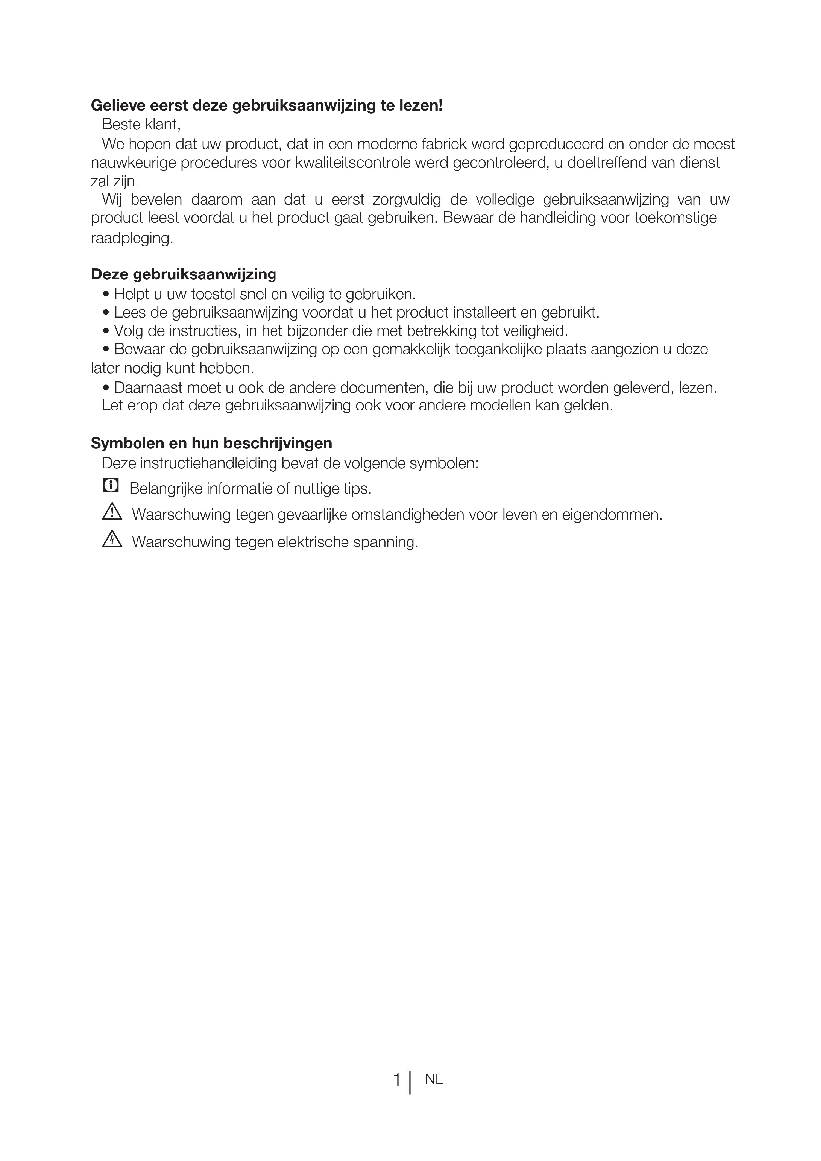 Gelieve eerst deze gebruiksaanwijzing te lezen! Beste klant, We hopen dat uw product, dat in een moderne fabriek werd geproduceerd en onder de meest nauwkeurige procedures voor kwaliteitscontrole werd gecontroleerd, u doeltreffend van dienst zal zijn. Wij bevelen daarom aan dat u eerst zorgvuldig de volledige gebruiksaanwijzing van uw product leest voordat u het product gaat gebruiken. Bewaar de handleiding voor toekomstige raadpleging. Deze gebruiksaanwijzing