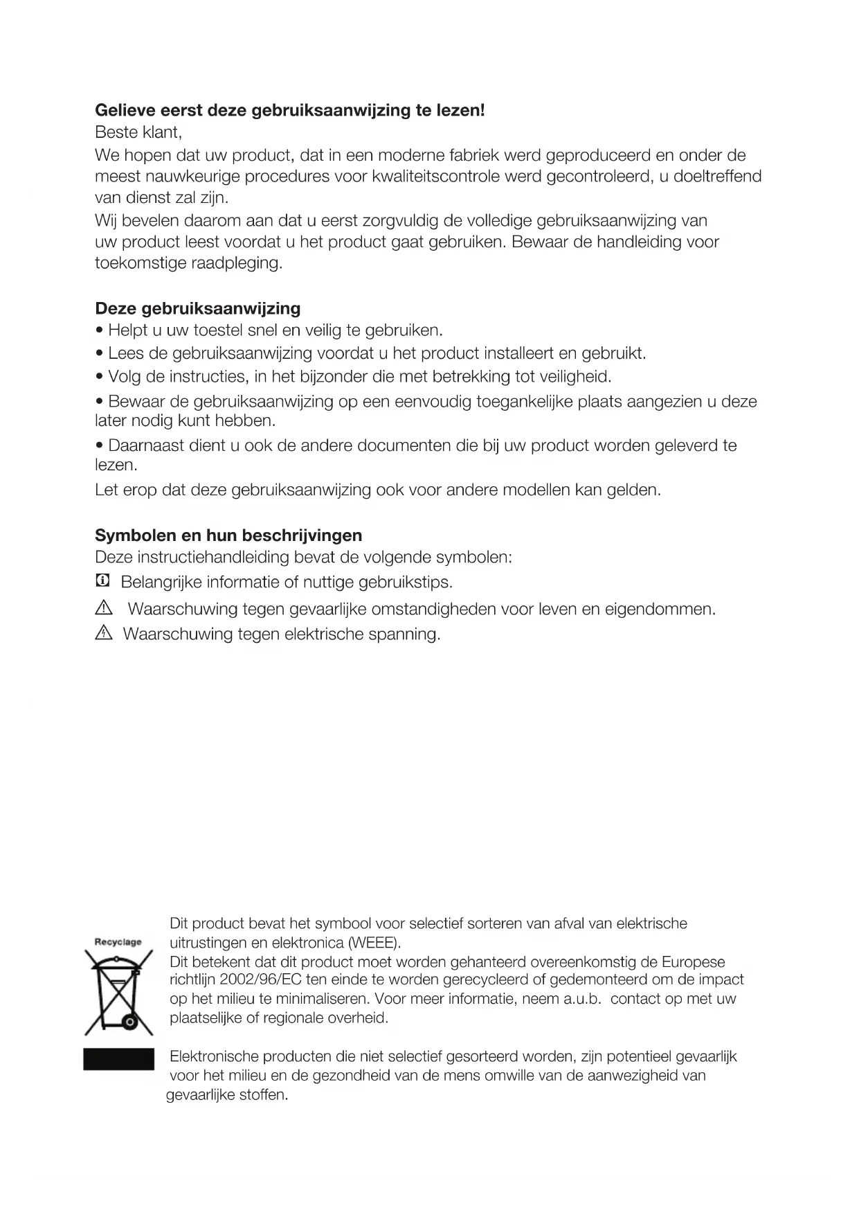 - Daarnaast dient u ook de andere documenten die bij uw product worden geleverd te lezen. Let erop dat deze gebruiksaanwijzing ook voor andere modellen kan gelden. Symbolen en hun beschrijvingen Deze instructiehandleiding bevat de volgende symbolen: C Belangrijke informatie of nuttige gebruikstips. A Waarschuwing tegen gevaarlijke omstandigheden voor leven en eigendommen. B Waarschuwing tegen elektrische spanning. Dit product bevat het symbool voor selectief sorteren van afval van elektrische uitrustingen en elektronica (WEEE). Dit betekent dat dit product moet worden gehanteerd overeenkomstig de Europese richtlijn 2002/96/EC ten einde te worden gerecycleerd of gedemonteerd om de impact op het milieu te minimaliseren. Voor meer informatie, neem a.u.b. contact op met uw plaatselijke of regionale overheid. Elektronische producten die niet selectief gesorteerd worden, zijn potentieel gevaarlijk voor het milieu en de gezondheid van de mens omwille van de aanwezigheid van gevaarlijke stoffen.NL