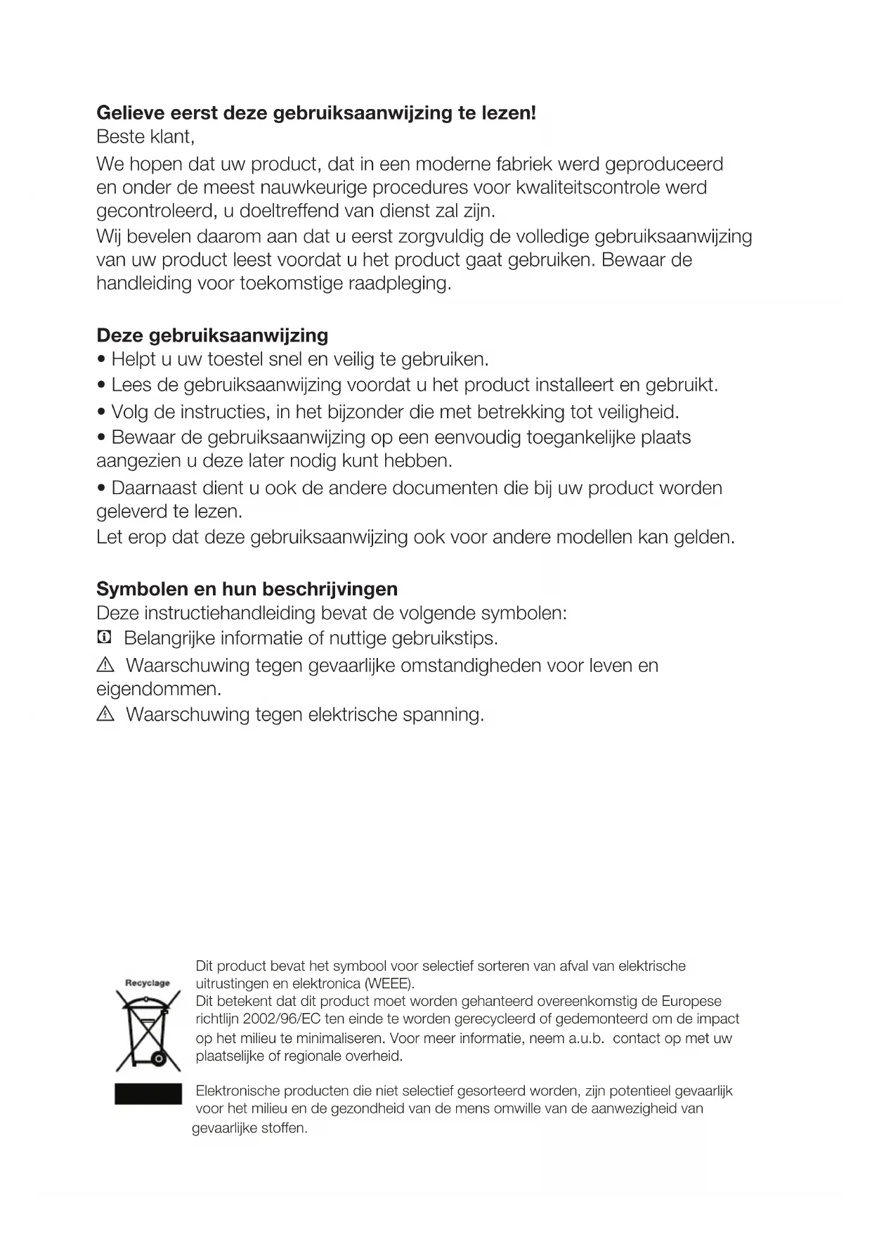 - Daarnaast dient u ook de andere documenten die bij uw product worden geleverd te lezen. Let erop dat deze gebruiksaanwijzing ook voor andere modellen kan gelden. Symbolen en hun beschrijvingen Deze instructiehandleiding bevat de volgende symbolen: C Belangrijke informatie of nuttige gebruikstips. A Waarschuwing tegen gevaarlijke omstandigheden voor leven en eigendommen. B Waarschuwing tegen elektrische spanning. Dit product bevat het symbool voor selectief sorteren van afval van elektrische uitrustingen en elektronica (WEEE). Dit betekent dat dit product moet worden gehanteerd overeenkomstig de Europese richtlijn 2002/96/EC ten einde te worden gerecycleerd of gedemonteerd om de impact op het milieu te minimaliseren. Voor meer informatie, neem a.u.b. contact op met uw plaatselijke of regionale overheid. Elektronische producten die niet selectief gesorteerd worden, zijn potentieel gevaarlijk voor het milieu en de gezondheid van de mens omwille van de aanwezigheid van gevaarlijke stoffen.NL