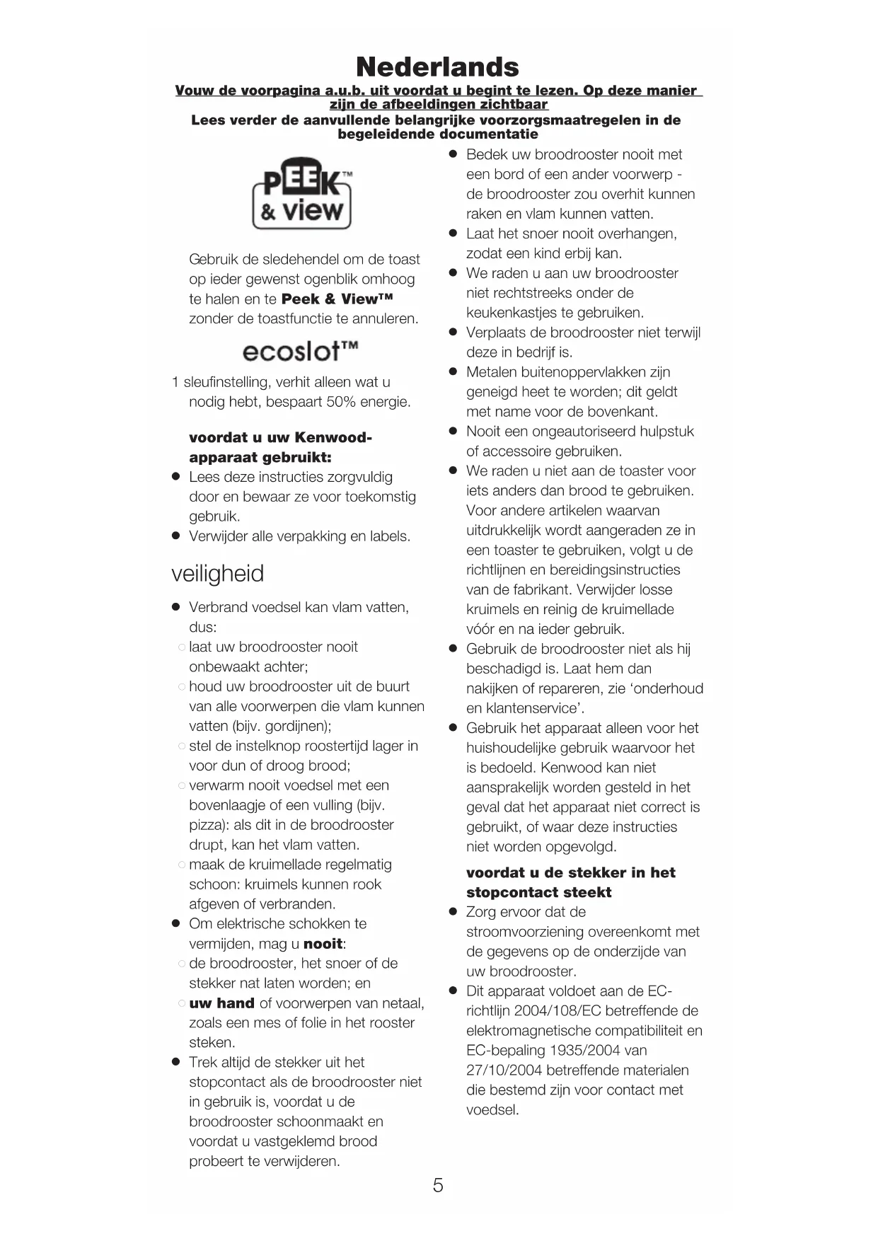 EUROPESE RICHTLIJN 2002/96/EC Aan het einde van de levensduur van het product mag het niet samen met het gewone huishoudelijke afval worden verwerkt. Het moet naar een speciaal centrum voor gescheiden afvalinzameling van de gemeente worden gebracht, of naar een verkooppunt dat deze service verschaft. Het apart verwerken van een huishoudelijk apparaat voorkomt mogelijke gevolgen voor het milieu en de gezondheid die door een ongeschikte verwerking ontstaan en zorgt ervoor dat de materialen waaruit het apparaat bestaat, teruggewonnen kunnen worden om een aanmerkelijke besparing van energie en grondstoffen te verkrijgen. Om op de verplichting tot gescheiden verwerking van elektrische huishoudelijke apparatuur te wijzen, is op het product het symbool van een doorgekruiste vuilnisbak aangebracht. 7Vous pouvez utiliser le levier Peek & View™ pour soulever et surveiller les aliments à tout moment, sans annuler le processus. Réglage pour 1 seule fente, pour ne griller que ce dont vous avez besoin, et réaliser 50 % d’économie d’énergie. avant d’utiliser votre appareil Kenwood