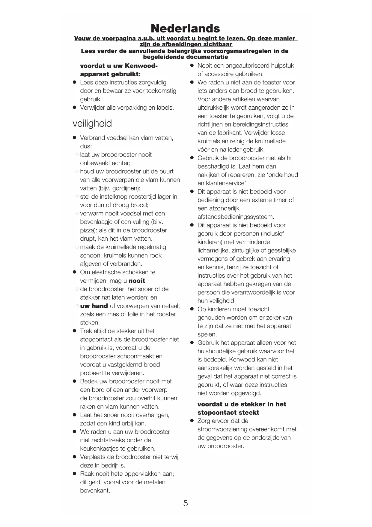Gebruik het apparaat alleen voor het huishoudelijke gebruik waarvoor het is bedoeld. Kenwood kan niet aansprakelijk worden gesteld in het geval dat het apparaat niet correct is gebruikt, of waar deze instructies niet worden opgevolgd. voordat u de stekker in het stopcontact steekt