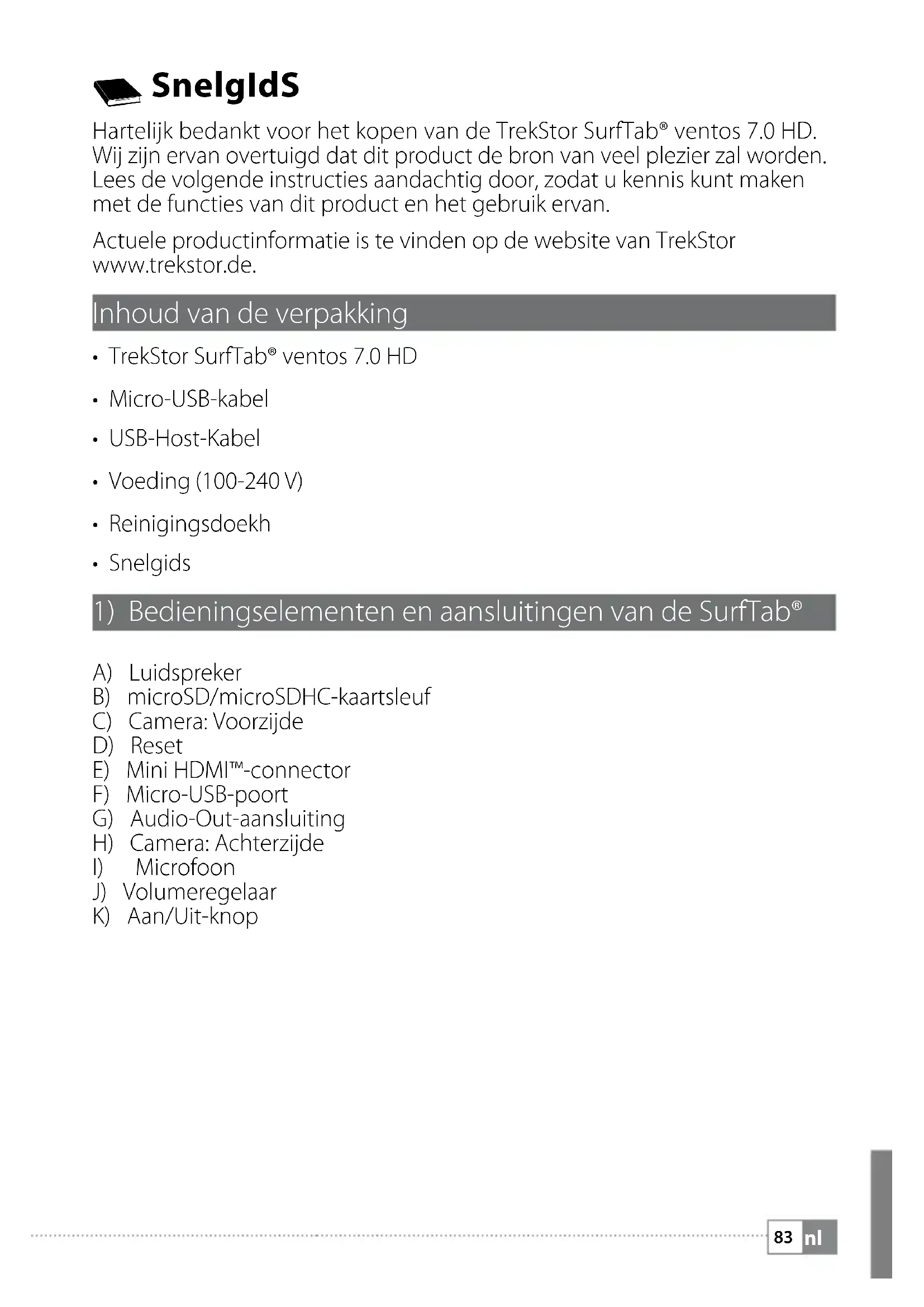 SnelgIdS Hartelijk bedankt voor het kopen van de TrekStor SurfTab® ventos 7.0 HD. Wij zijn ervan overtuigd dat dit product de bron van veel plezier zal worden. Lees de volgende instructies aandachtig door, zodat u kennis kunt maken met de functies van dit product en het gebruik ervan. Actuele productinformatie is te vinden op de website van TrekStor www.trekstor.de. Inhoud van de verpakking