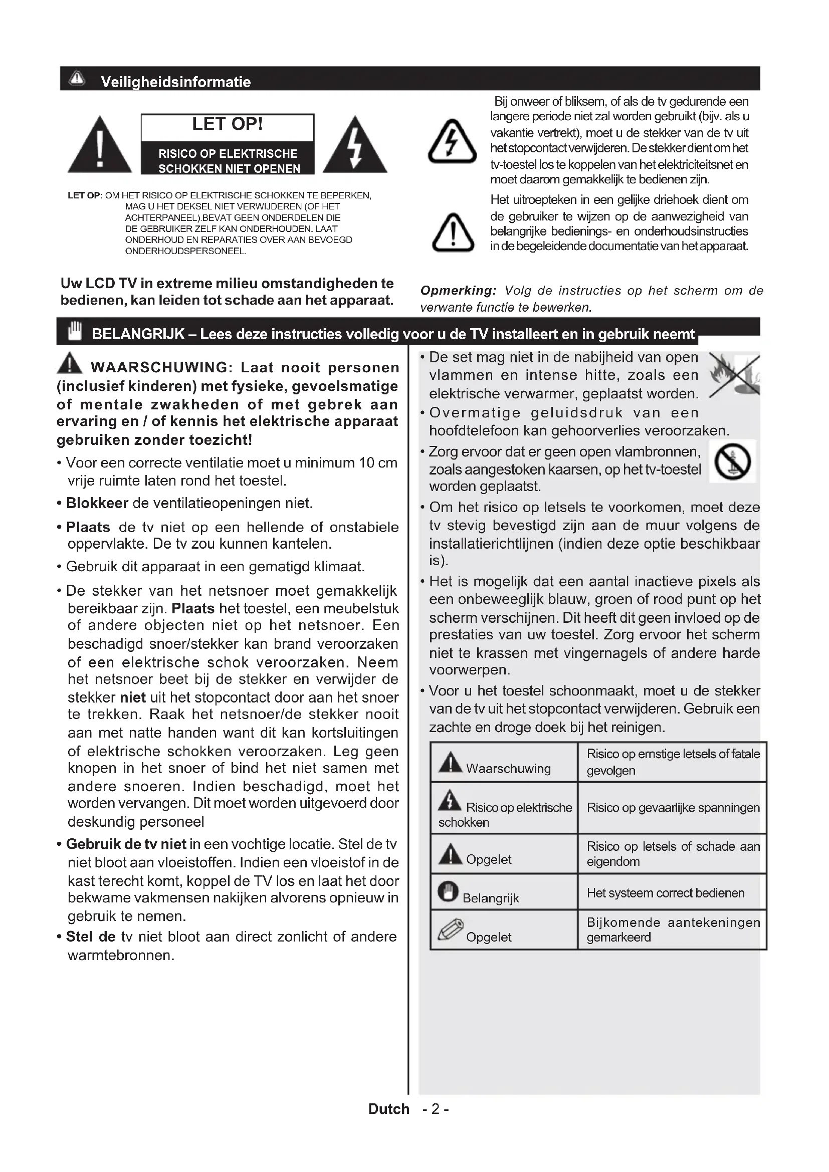 - Voor u het toestel schoonmaakt, moet u de stekker van de tv uit het stopcontact verwijderen. Gebruik een zachte en droge doek bij het reinigen. Waarschuwing Risico op ernstige letsels of fatale gevolgen Risico op elektrische schokken Risico op gevaarlijke spanningen Opgelet Risico op letsels of schade aan eigendom Belangrijk Het systeem correct bedienen Opgelet Bijkomende aantekeningen gemarkeerd Bij onweer of bliksem, of als de tv gedurende een langere periode niet zal worden gebruikt (bijv. als u vakantie vertrekt), moet u de stekker van de tv uit het stopcontact verwijderen. De stekker dient om het tv-toestel los te koppelen van het elektriciteitsnet en moet daarom gemakkelijk te bedienen zijn. Het uitroepteken in een gelijke driehoek dient om de gebruiker te wijzen op de aanwezigheid van belangrijke bedienings- en onderhoudsinstructies in de begeleidende documentatie van het apparaat. BELANGRIJK – Lees deze instructies volledig voor u de TV installeert en in gebruik neemt Opmerking: Volg de instructies op het scherm om de verwante functie te bewerken. Uw LCD TV in extreme milieu omstandigheden te bedienen, kan leiden tot schade aan het apparaat. LET OP!