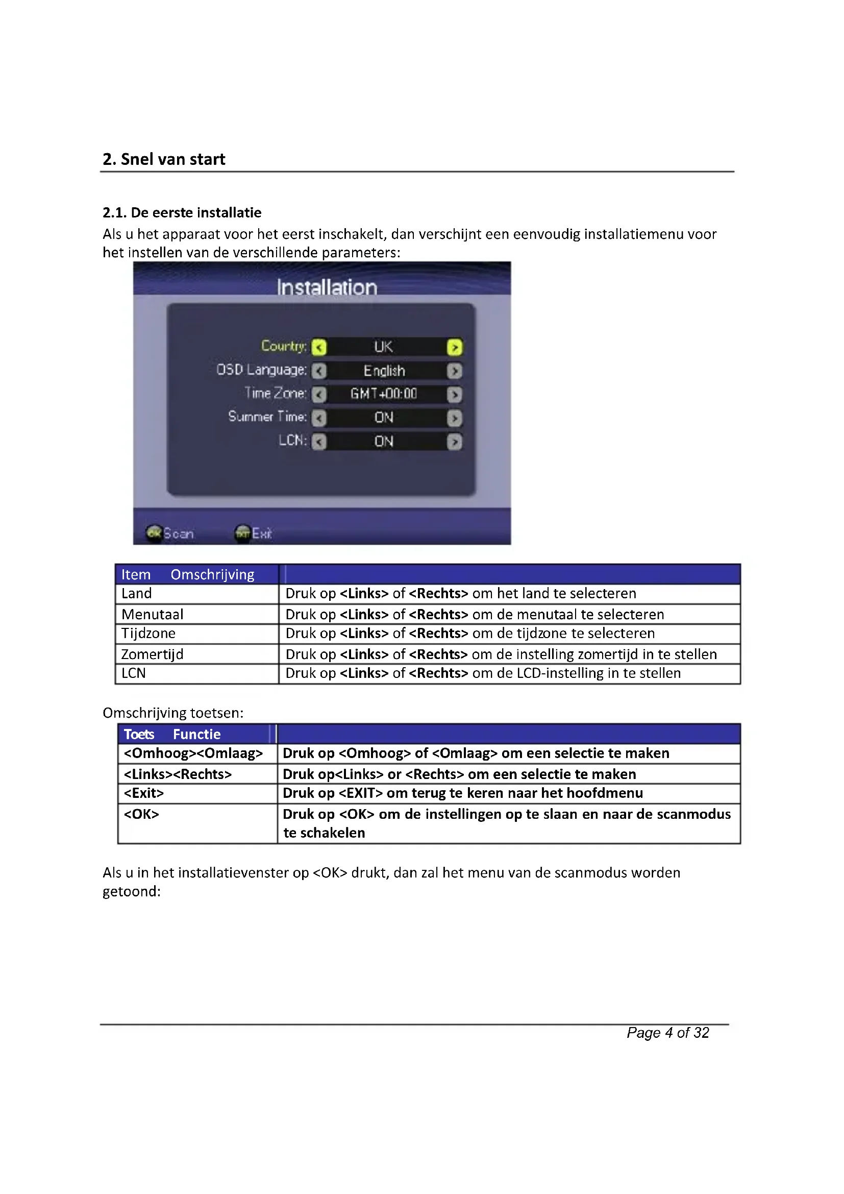 Omschrijvingtoetsen: Toets Functie <Omhoog><Omlaag> Drukop<Omhoog>of<Omlaag>omeenselectietemaken <Links><Rechts> Drukop<Links>or<Rechts>omeenselectietemaken <Exit> Drukop<EXIT>omterugtekerennaarhethoofdmenu <OK> Drukop<OK>omdeinstellingenopteslaanennaardescanmodus teschakelen