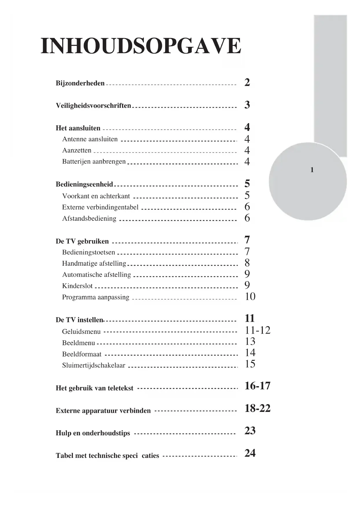 INHOUDSOPGAVE Bijzonderheden Veiligheidsvoorschriften Het aansluiten Antenne aansluiten Aanzetten Batterijen aanbrengen Bedieningseenheid Voorkant en achterkant Externe verbindingentabel Afstandsbediening De TV gebruiken Bedieningstoetsen Handmatige afstelling Automatische afstelling Kinderslot Programma aanpassing De TV instellen Geluidsmenu Beeldmenu Beeldformaat Sluimertijdschakelaar Het gebruik van teletekst Externe apparatuur verbinden Hulp en onderhoudstips Tabel met technische specificaties