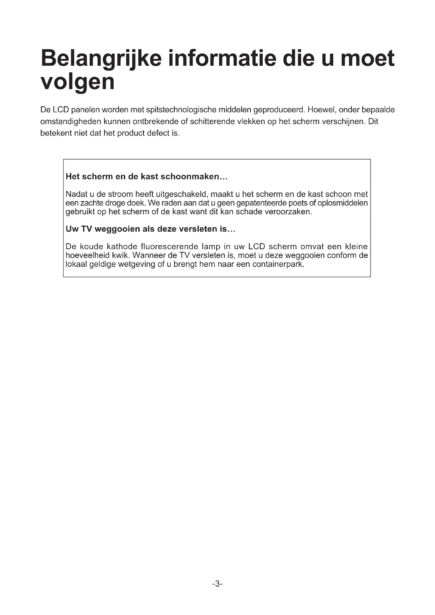 De koude cathode fluorescerende lamp in uw LCD scherm omvat een kleine hoeveelheid kwik. Wanner de TV versleten is, moet u deze weggooien conform de lokaal geldige wetgeving of u brengt hem maar een containerpark.
