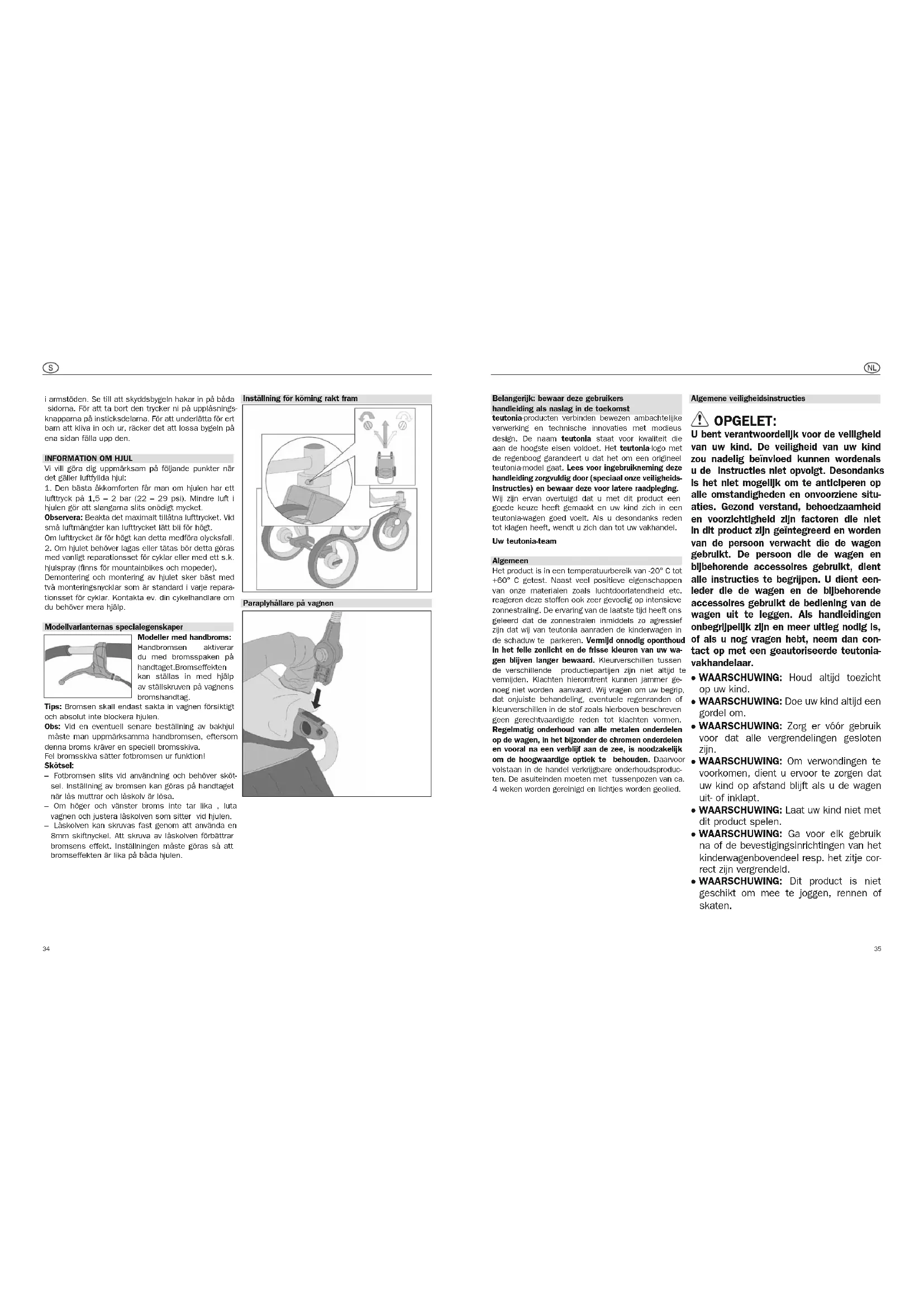 med vanligt reparationsset för cyklar eller med ett s.k. hjulspray (finns för mountainbikes och mopeder). Demontering och montering av hjulet sker bäst med två monteringsnycklar som är standard i varje repara- tionsset för cyklar. Kontakta ev. din cykelhandlare om du behöver mera hjälp. Modellvarianternas specialegenskaper Modeller med handbroms: Handbromsen aktiverar du med bromsspaken på handtaget. Bromseffekten kan ställas in med hjälp av ställskruven på vagnens bromshandtag. Tips: Bromsen skall endast sakta in vagnen försiktigt och absolut inte blockera hjulen. Obs: Vid en eventuell senare beställning av bakhjul måste man uppmärksamma handbromsen, eftersom denna broms kräver en speciell bromsskiva. Fel bromsskiva sätter fotbromsen ur funktion! Skötsel: – Fotbromsen slits vid användning och behöver sköt- sel. Inställning av bromsen kan göras på handtaget när lås muttrar och låskolv är lösa. – Om höger och vänster broms inte tar lika , luta vagnen och justera låskolven som sitter vid hjulen. – Låskolven kan skruvas fast genom att använda en 8mm skiftnyckel. Att skruva av låskolven förbättrar bromsens effekt. Inställningen måste göras så att bromseffekten är lika på båda hjulen. Inställning för körning rakt fram Paraplyhållare på vagnen 34● WAARSCHUWING: Elk gewicht bevestigd aan de duw-stang en/of rugleuning en/of de zijkant veranderd de stabiliteit van de kinderwagen. Meer belangrijke veiligheidsinstructies ● teutonia kan niet de veiligheid garanderen van het produkt indien accesoirs/reser- ver onderdelen gebruikt worden die niet door teutonia gefabriceerd of vrijgegeven. Indien dit zulke accesoirs of reserve on- derdelen gebruikt worden vervalt direct de garantie. ● Deze kinderwagen is uitsluitend bestemd voor één kind. ● De ziteenheid of de reiswieg mogen niet in de auto worden gebruikt. ● Het kinderwagenstoeltje is ontwikkeld voor een kind vanaf geboorte tot 15kg. ● Reiswiegen resp. kinder- en wandelwa- gens mogen alleenvoor vervoer gebruikt worden en vormen in geengeval een ver- vanging van bed of wiegje. ● Parkeer de wagen altijd buiten het bereik van kinderen en laat kinderen niet in of met de wagen spelen. ● Parkeer de wagen nooit zonder eerst de rem te hebben vastgezet. Controleer of de rem ook veilig is vastgeklikt. ● De remmen moeten altijd vastgezet zijn als u uw kind in de wagen zet of uit de wagen neemt. ● Nooit op een helling parkeren. ● Let er ook in openbare verkeersmiddelen in het bijzonder op dat de wagen stevig staat. ● De wagen langzaam en voorzichtig over de treden van trappen laten rollen. ● Leg nooit voorwerpen op de kap. ● De maximale belasting van het bood- schappennet bedraagt 5 kg (11 lbs). Leg zware voorwerpen altijd in het midden van de boodschappenmand. ● Let er bij het open- en dichtklappen van het frame altijd op dat u of anderen niet ingeklemd raken. ● Let er bij het dragen van de wagen over obstakels (bijv. trappen) op dat er geen vergrendelingen losraken. ● Let er bij het verstellen op dat het kind zich niet in de buurt van beweegbare on- derdelen bevindt. ● Een te zware belading, incorrect inklappen en het gebruik van niet toegestane acces- soires kunnen de wagen beschadigen of kapot maken. ● De voetsteun is niet geschikt voor het transporteren van lasten of een tweede kind. ● Wanneer u de wagen voor de eerste keer gebruikt: verwijder a.u.b. alle stickers en labels die NIETS met de veiligheidsin- structies te maken hebben. ● Gebruik de voetensteun of de bescherm- beugel nooit om de wagen op te tillen of te dragen. ● voor baby‘s tot 6maanden is onze aan- beveling om de rugleuning complete vlak te stellen. Neerzetten van de wagen Opgelet: de banden kunnen onder bepaalde omstan- digheden tot verkleuren van de vloerbedekking leiden. Stukjes (bijv. steentjes) in de banden moeten verwij- derd worden om eventuele schade aan de vloerbe- dekking te vermijden. Extreme hitte, met name direct contact met hete oppervlakken (b.v. in de zomer in de auto) kan bij luchtbanden tot blijvende vervormingen leiden. Klachten of schadeclaims op grond hiervan worden niet in behandeling genomen. Reinigen van de stoffen onderdelen Neem voor kleineren vlekken een vochtige doek en schoon water en maak voorzichtig de betreffende plek schoon. Wrijf niet te hard (in het bijzonder bij donkere stoffen). Alle afneembare stofdelen kunt u normaal gesproken met een fijnwasmiddel(zonder op- tische kleurop haler) in de wasmachine op 30 °C (fijne was) wassen. Zie de aparte gebruiksaanwijzing an het stofdeel. Regenhoes Bij regen moet de regenhoes tijdig over de gehele wagen gespannen worden. Opgelet: De regenhoes is geen speelgoed! Laat uw kind nooit zonder toezicht! Voor een optimale ventilatie van de wagen raden wij aan de regen hoes alleen tijdens de regenbui te spannen. Aftrekken van de afdekkapbekleding Voor het wassen moeten de twee kapbeugels uit de bekleding worden gehaald. (Zie tekening) Draai de schroef met een schroevendraaier los en verwijder de drukknoop. Trek nu de kapbeugels uit de klem en uit de kapbekleding. Na het wassen monteert u de bekleding in omgekeerde volgorde. Let erop dat daarbij de kapbeugels in de twee doorge- stikte sleuven worden geschoven. De voor- en achter- beugel mogen niet worden verwisseld. Opbouwen van het onderstel Transportbeveiliging (4) indrukken en wagen aan de zwenkbare duwstang (5) open klappen totdat hij hoor- baar in de afgebeelde positie (6) vastklikt. WAARSCHUWING: Controleer voor het ge- bruik of alle vergrendelingen gesloten zijn. Montage en demontage van de wielen Achterwielen: Om het achterwiel af te nemen: – Druk op de vergrendeling (7) en trek het wiel van de as. Om het wiel opnieuw te bevestigen, duwt u het ge- woon weer op de as. Controleer of het wiel goed vastzit door eraan te trekken! Voorwielen: Om het wiel af te nemen, drukt u op de vergrendeling (10) en trekt u de stuuras eruit. Om het wiel opnieuw te bevestigen, duwt u de