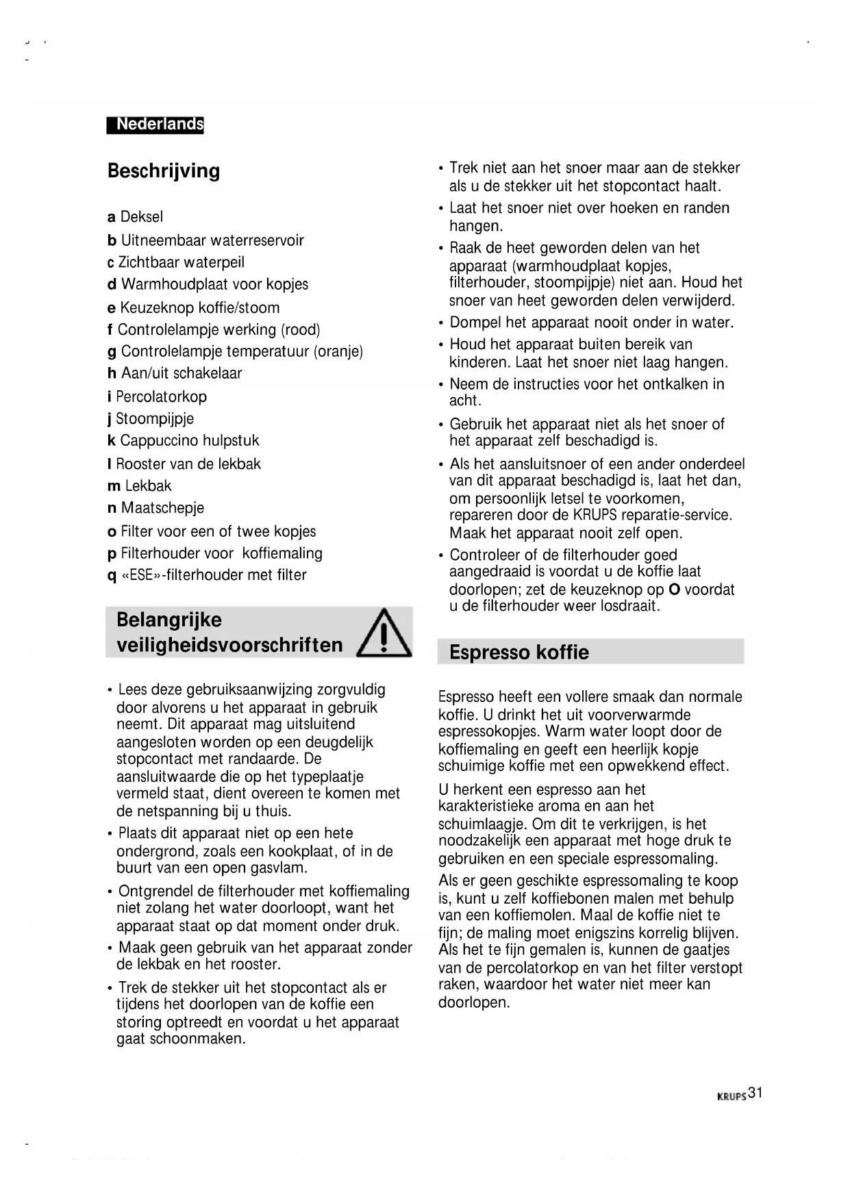 - Faites refroidir et ajoutez l’expresso et la crème fouettée. (* : L’abus d’alcool est dangereux pour la santé.) FNC1/2/3.PM6.5 19/01/04, 16:173031 Beschrijving a Deksel b Uitneembaar waterreservoir c Zichtbaar waterpeil d Warmhoudplaat voor kopjes e Keuzeknop koffie/stoom f Controlelampje werking (rood) g Controlelampje temperatuur (oranje) h Aan/uit schakelaar i Percolatorkop j Stoompijpje k Cappuccino hulpstuk l Rooster van de lekbak m Lekbak n Maatschepje o Filter voor een of twee kopjes p Filterhouder voor koffiemaling q «ESE»-filterhouder met filter Belangrijke veiligheidsvoorschriften