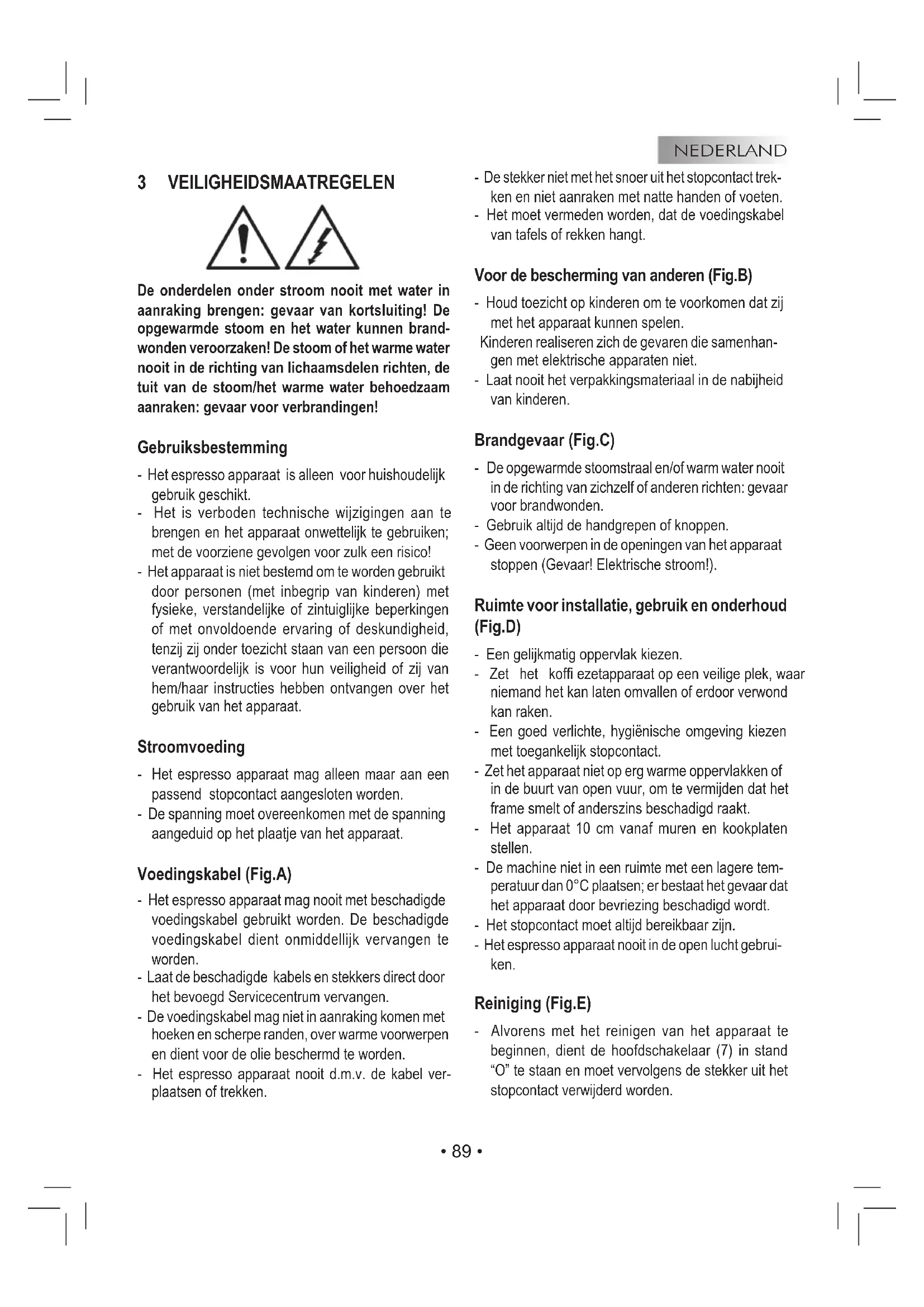 - 89 • 3 VEILIGHEIDSMAATREGELEN De onderdelen onder stroom nooit met water in aanraking brengen: gevaar van kortsluiting! De opgewarmde stoom en het water kunnen brand- wonden veroorzaken! De stoom of het warme water nooit in de richting van lichaamsdelen richten, de tuit van de stoom/het warme water behoedzaam aanraken: gevaar voor verbrandingen! Gebruiksbestemming - Het espresso apparaat is alleen voor huishoudelijk gebruik geschikt. - Het is verboden technische wijzigingen aan te brengen en het apparaat onwettelijk te gebruiken; met de voorziene gevolgen voor zulk een risico! - Het apparaat is niet bestemd om te worden gebruikt door personen (met inbegrip van kinderen) met fysieke, verstandelijke of zintuiglijke beperkingen of met onvoldoende ervaring of deskundigheid, tenzij zij onder toezicht staan van een persoon die verantwoordelijk is voor hun veiligheid of zij van hem/haar instructies hebben ontvangen over het gebruik van het apparaat. Stroomvoeding - Het espresso apparaat mag alleen maar aan een passend stopcontact aangesloten worden. - De spanning moet overeenkomen met de spanning aangeduid op het plaatje van het apparaat. Voedingskabel (Fig.A) - Het espresso apparaat mag nooit met beschadigde voedingskabel gebruikt worden. De beschadigde voedingskabel dient onmiddellijk vervangen te worden. - Laat de beschadigde kabels en stekkers direct door het bevoegd Servicecentrum vervangen. - De voedingskabel mag niet in aanraking komen met hoeken en scherpe randen, over warme voorwerpen en dient voor de olie beschermd te worden. - Het espresso apparaat nooit d.m.v. de kabel ver- plaatsen of trekken. - De stekker niet met het snoer uit het stopcontact trek- ken en niet aanraken met natte handen of voeten. - Het moet vermeden worden, dat de voedingskabel van tafels of rekken hangt. Voor de bescherming van anderen (Fig.B) - Houd toezicht op kinderen om te voorkomen dat zij met het apparaat kunnen spelen. Kinderen realiseren zich de gevaren die samenhan- gen met elektrische apparaten niet. - Laat nooit het verpakkingsmateriaal in de nabijheid van kinderen. Brandgevaar (Fig.C) - De opgewarmde stoomstraal en/of warm water nooit in de richting van zichzelf of anderen richten: gevaar voor brandwonden. - Gebruik altijd de handgrepen of knoppen. - Geen voorwerpen in de openingen van het apparaat stoppen (Gevaar! Elektrische stroom!). Ruimte voor installatie, gebruik en onderhoud (Fig.D) - Een gelijkmatig oppervlak kiezen. - Zet het koffi ezetapparaat op een veilige plek, waar niemand het kan laten omvallen of erdoor verwond kan raken. - Een goed verlichte, hygiënische omgeving kiezen met toegankelijk stopcontact. - Zet het apparaat niet op erg warme oppervlakken of in de buurt van open vuur, om te vermijden dat het frame smelt of anderszins beschadigd raakt. - Het apparaat 10 cm vanaf muren en kookplaten stellen. - De machine niet in een ruimte met een lagere tem- peratuur dan 0°C plaatsen; er bestaat het gevaar dat het apparaat door bevriezing beschadigd wordt. - Het stopcontact moet altijd bereikbaar zijn. - Het espresso apparaat nooit in de open lucht gebrui- ken. Reiniging (Fig.E) - Alvorens met het reinigen van het apparaat te beginnen, dient de hoofdschakelaar (7) in stand “O” te staan en moet vervolgens de stekker uit het stopcontact verwijderd worden.NEDERLAND
