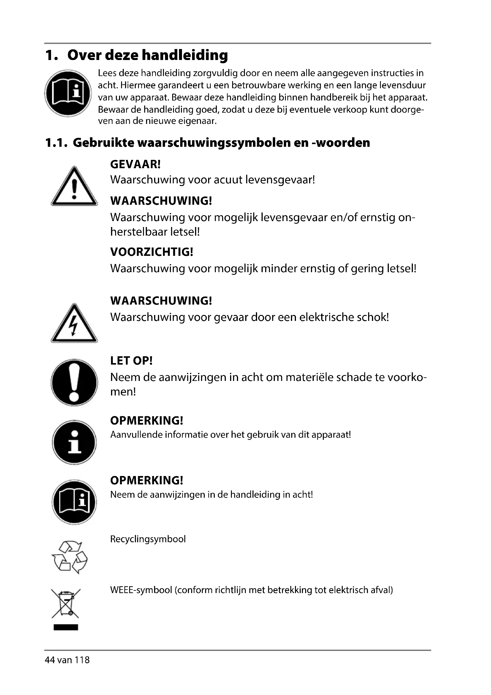 Lees deze handleiding zorgvuldig door en neem alle aangegeven instructies in acht. Hiermee garandeert u een betrouwbare werking en een lange levensduur van uw apparaat. Bewaar deze handleiding binnen handbereik bij het apparaat. Bewaar de handleiding goed, zodat u deze bij eventuele verkoop kunt doorge- ven aan de nieuwe eigenaar. 1.1. Gebruikte waarschuwingssymbolen en -woorden GEVAAR! Waarschuwing voor acuut levensgevaar! WAARSCHUWING! Waarschuwing voor mogelijk levensgevaar en/of ernstig on- herstelbaar letsel! VOORZICHTIG! Waarschuwing voor mogelijk minder ernstig of gering letsel! WAARSCHUWING! Waarschuwing voor gevaar door een elektrische schok! LET OP! Neem de aanwijzingen in acht om materiële schade te voorko- men! OPMERKING! Aanvullende informatie over het gebruik van dit apparaat! OPMERKING! Neem de aanwijzingen in de handleiding in acht! Recyclingsymbool WEEE-symbool (conform richtlijn met betrekking tot elektrisch afval)DE
