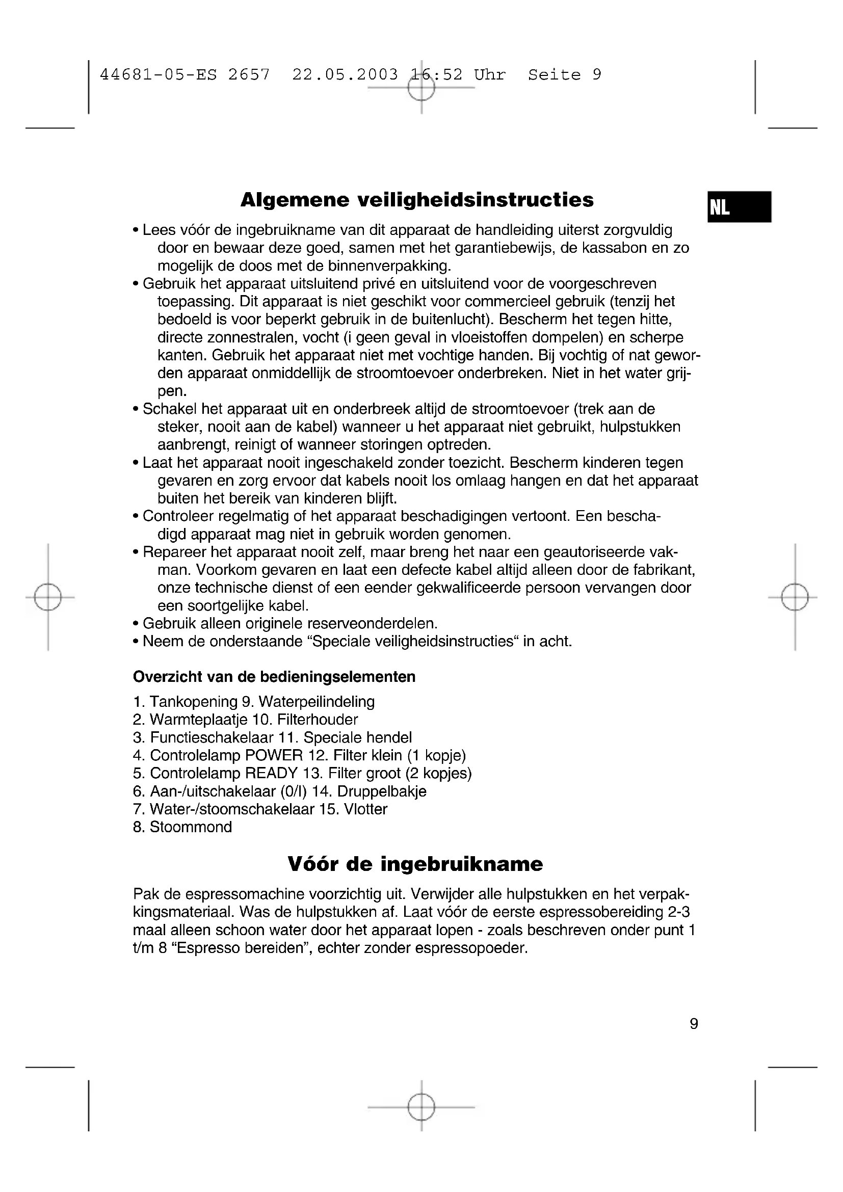 Vóór de ingebruikname Pak de espressomachine voorzichtig uit. Verwijder alle hulpstukken en het verpak- kingsmateriaal. Was de hulpstukken af. Laat vóór de eerste espressobereiding 2-3 maal alleen schoon water door het apparaat lopen - zoals beschreven onder punt 1 t/m 8 “Espresso bereiden”, echter zonder espressopoeder.