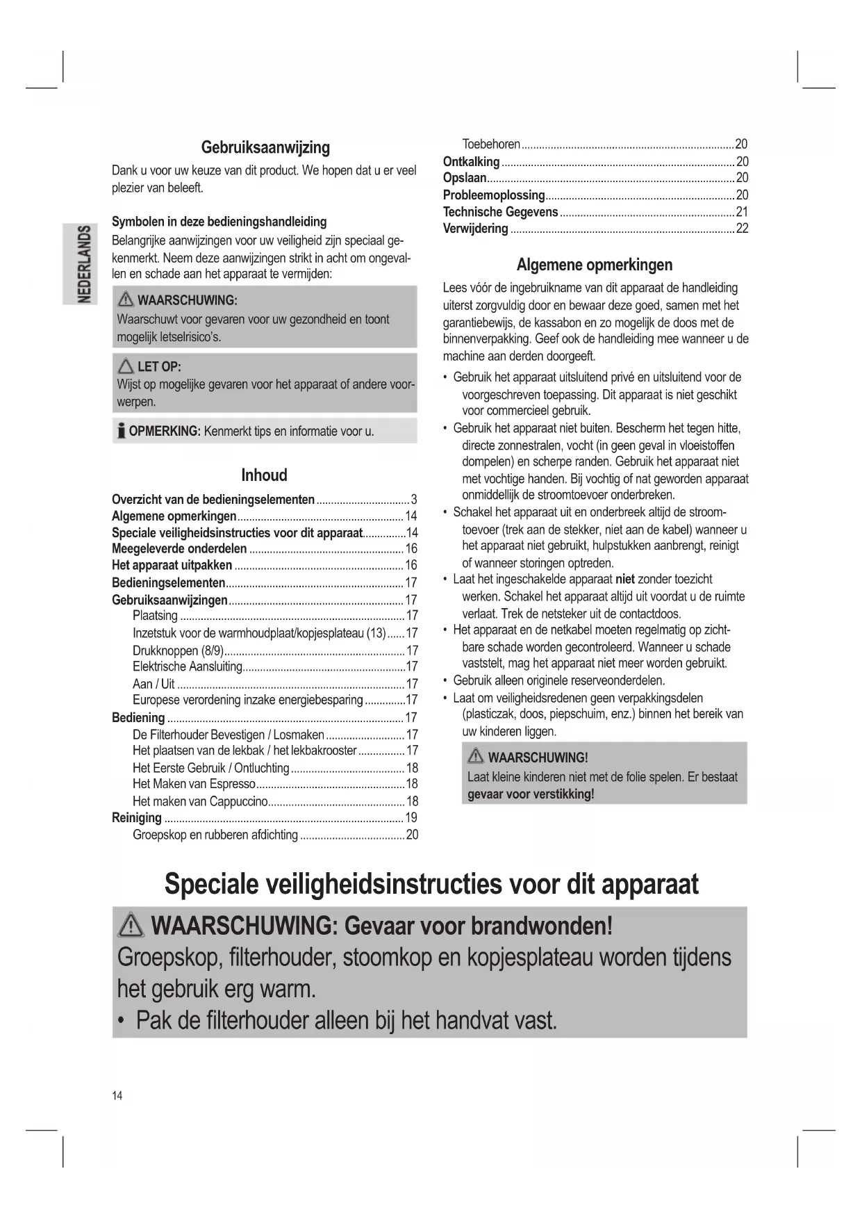 - Laat om veiligheidsredenen geen verpakkingsdelen (plasticzak, doos, piepschuim, enz.) binnen het bereik van uw kinderen liggen. WAARSCHUWING! Laat kleine kinderen niet met de folie spelen. Er bestaat gevaar voor verstikking! Gebruiksaanwijzing Dank u voor uw keuze van dit product. We hopen dat u er veel plezier van beleeft. Symbolen in deze bedieningshandleiding Belangrijke aanwijzingen voor uw veiligheid zijn speciaal ge- kenmerkt. Neem deze aanwijzingen strikt in acht om ongeval- len en schade aan het apparaat te vermijden: WAARSCHUWING: Waarschuwt voor gevaren voor uw gezondheid en toont mogelijk letselrisico’s. LET OP: Wijst op mogelijke gevaren voor het apparaat of andere voor- werpen. OPMERKING: Kenmerkt tips en informatie voor u. Inhoud Overzicht van de bedieningselementen ................................ 3 Algemene opmerkingen .........................................................14 Speciale veiligheidsinstructies voor dit apparaat...............14 Meegeleverde onderdelen .....................................................16 Het apparaat uitpakken ..........................................................16 Bedieningselementen .............................................................17 Gebruiksaanwijzingen ............................................................17 Plaatsing .............................................................................17 Inzetstuk voor de warmhoudplaat/kopjesplateau (13) ...... 17 Drukknoppen (8/9) ..............................................................17 Elektrische Aansluiting........................................................17 Aan / Uit ..............................................................................17 Europese verordening inzake energiebesparing ..............17 Bediening .................................................................................17 De Filterhouder Bevestigen / Losmaken ........................... 17 Het plaatsen van de lekbak / het lekbakrooster ................ 17 Het Eerste Gebruik / Ontluchting ....................................... 18 Het Maken van Espresso ................................................... 18 Het maken van Cappuccino ...............................................18 Reiniging ..................................................................................19 Groepskop en rubberen afdichting ....................................20 Speciale veiligheidsinstructies voor dit apparaat WAARSCHUWING: Gevaar voor brandwonden! Groepskop, lterhouder, stoomkop en kopjesplateau worden tijdens het gebruik erg warm.