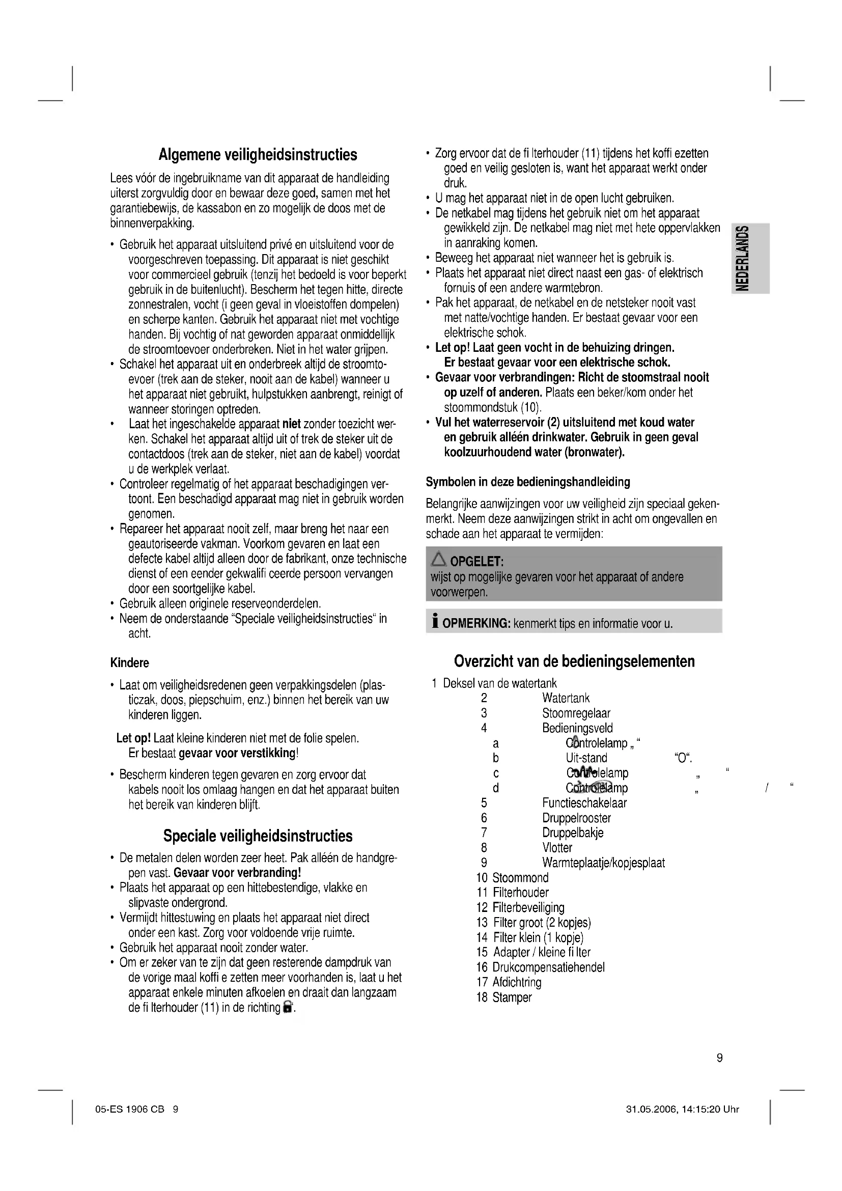 - Vul het waterreservoir (2) uitsluitend met koud water en gebruik alléén drinkwater. Gebruik in geen geval koolzuurhoudend water (bronwater). Symbolen in deze bedieningshandleiding Belangrijke aanwijzingen voor uw veiligheid zijn speciaal geken- merkt. Neem deze aanwijzingen strikt in acht om ongevallen en schade aan het apparaat te vermijden: OPGELET: wijst op mogelijke gevaren voor het apparaat of andere voorwerpen. OPMERKING: kenmerkt tips en informatie voor u. Overzicht van de bedieningselementen 1 Deksel van de watertank 2 Watertank 3 Stoomregelaar 4 Bedieningsveld a Controlelamp „ “ b Uit-stand “O“. c Controlelamp „ “ d Controlelamp „ / “ 5 Functieschakelaar 6 Druppelrooster 7 Druppelbakje 8 Vlotter 9 Warmteplaatje/kopjesplaat 10 Stoommond 11 Filterhouder 12 Filterbeveiliging 13 Filter groot (2 kopjes) 14 Filter klein (1 kopje) 15 Adapter / kleine fi lter 16 Drukcompensatiehendel 17 Afdichtring 18 Stamper 05-ES 1906 CB 9 31.05.2006, 14:15:20 Uhr10 NEDERLANDS NEDERLANDS Eerste ingebruikname/Ontluchting OPGELET: Het apparaat moet vooral vóór het eerste gebruik of wanneer u het apparaat gedurende een langere periode niet hebt gebruikt, ontlucht worden. Gebruik hierbij géén esspressopoe- der!