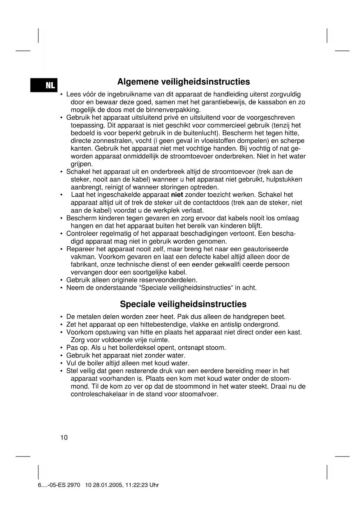- Stel veilig dat geen resterende druk van een eerdere bereiding meer in het apparaat voorhanden is. Plaats een kom met koud water onder de stoom- mond. Til de kom zo ver op dat de stoommond in het water steekt. Draai nu de controleschakelaar in de stand voor stoomafvoer. 6....-05-ES 2970 10 28.01.2005, 11:22:23 UhrNL