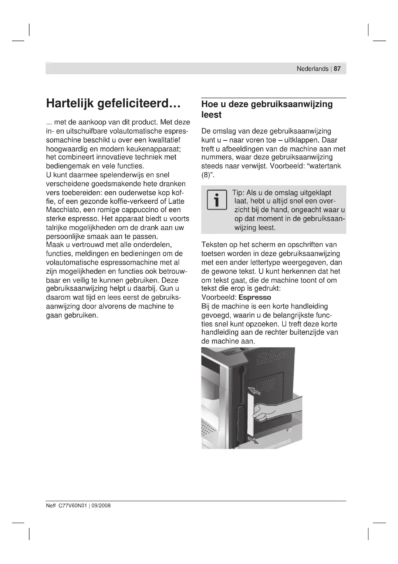 Questo apparecchio è contrassegnato con- formemente alla Direttiva europea 2002/96/ CE Riuti di apparecchiature elettriche ed elettroniche (waste electrical and electronic equipement – WEEE). La direttiva stabilisce il quadro generale per un ritiro e recupero valido in tutta I‘UE. Informarsi presso il riven- ditore specializzato sulle attuali disposizioni per la rottamazione. Garanzia Per questo apparecchio sono valide le condi- zioni di garanzia pubblicate dal nostro rappre- sentante nel paese di vendita. Il rivenditore, presso il quale è stato acquistato l’apparec- chio, è sempre ben disposto a fornire a richie- sta informazioni a proposito. Per l’esercizio del diritto di garanzia è comunque necessario presentare il documento di acquisto. Con riserva di modica.86 | Italiano Neff C77V60N01 | 09/2008 Problema Causa/situazione Soluzione Il caffè fuoriesce solo a gocce. Il grado di macinatura è troppo ne. Il caffè in polvere è troppo ne. Regolare su un grado di macinatura più grosso. Utilizzare un caffè macinato più grosso. L’apparecchio presenta forti calcicazioni. Decalcicare l’apparecchio. Il caffè non ha alcuna “crema” (strato di schiuma). Tipo di caffè non adatto. Cambiare il tipo di caffè. I chicchi di caffè non sono tostati di fresco. Utilizzare chicchi tostati di fresco. Il grado di macinatura non è adatto ai chicchi di caffè. Regolare su un grado di macinatura ne. Forte rumore del macinacaffè. Nel macinacaffè è penetrato un corpo estraneo (ad esempio un sassolino, che può essere presente anche nei caffè più pregiati). Mettersi in contatto con l’Assistenza, non preparare più caffè in chicchi. È tuttavia possibile continuare a preparare il caffè con il caffè in polvere. Il caffè è troppo “acido”. Il grado di macinatura impostato è troppo grosso oppure il caffè in polvere è troppo grosso. Impostare un grado di macinatura più ne oppure utilizzare un caffè in polvere più ne. Il caffè è troppo “amaro”. Il grado di macinatura impostato è troppo ne oppure il caffè in polvere è troppo ne. Impostare un grado di macinatura più grosso oppure utilizzare un caffè in polvere più grosso. Tipo di caffè non adatto. Cambiare il tipo di caffè. Indicazione sul display Errore Chiamare l‘Assistenza Nell’apparecchio si è vericato un errore. Chiamare l’Assistenza (ved. risvolto della copertina posteriore). Qualora non sia possibile eliminare un guasto o un errore, non provare a trovare da soli l’errore, a smontare l’apparecchio oppure a ripararlo da soli. Chiamare l’Assistenza (ved. ris- volto della copertina posteriore).Nederlands | 87 Neff C77V60N01 | 09/2008 Hartelijk gefeliciteerd… ... met de aankoop van dit product. Met deze in- en uitschuifbare volautomatische espres- somachine beschikt u over een kwalitatief hoogwaardig en modern keukenapparaat; het combineert innovatieve techniek met bediengemak en vele functies. U kunt daarmee spelenderwijs en snel verscheidene goedsmakende hete dranken vers toebereiden: een ouderwetse kop kof- e, of een gezonde kofe-verkeerd of Latte Macchiato, een romige cappuccino of een sterke espresso. Het apparaat biedt u voorts talrijke mogelijkheden om de drank aan uw persoonlijke smaak aan te passen. Maak u vertrouwd met alle onderdelen, functies, meldingen en bedieningen om de volautomatische espressomachine met al zijn mogelijkheden en functies ook betrouw- baar en veilig te kunnen gebruiken. Deze gebruiksaanwijzing helpt u daarbij. Gun u daarom wat tijd en lees eerst de gebruiks- aanwijzing door alvorens de machine te gaan gebruiken. Hoe u deze gebruiksaanwijzing leest De omslag van deze gebruiksaanwijzing kunt u – naar voren toe – uitklappen. Daar treft u afbeeldingen van de machine aan met nummers, waar deze gebruiksaanwijzing steeds naar verwijst. Voorbeeld: “watertank (8)”. Tip: Als u de omslag uitgeklapt laat, hebt u altijd snel een over- zicht bij de hand, ongeacht waar u op dat moment in de gebruiksaan- wijzing leest. Teksten op het scherm en opschriften van toetsen worden in deze gebruiksaanwijzing met een ander lettertype weergegeven, dan de gewone tekst. U kunt herkennen dat het om tekst gaat, die de machine toont of om tekst die erop is gedrukt: Voorbeeld: Espresso Bij de machine is een korte handleiding gevoegd, waarin u de belangrijkste func- ties snel kunt opzoeken. U treft deze korte handleiding aan de rechter buitenzijde van de machine aan.88 | Nederlands Neff C77V60N01 | 09/2008 Inhoud 89 Veiligheidsaanwijzing 89 Samenbouw en onderdelen 90 Bedieningen en meldingen 90 Netspanningschakelaar O/I 90 Menu en scherm 91 Uittreksysteem 91 Accessoires 91 Meldingen op het scherm 92 In gebruik nemen 92 Algemeen 93 Apparaat in gebruik nemen 94 Toebereiden van dranken 94 Drankkeuze 94 Een voorbeeld 95 Bereiden met poederkofe 95 Bereiden met melk 96 Twee kopjes tegelijk 96 My coffee 97 Melkschuim en warme melk bereiden 98 Heet water tappen 98 Informatie en instellingen 98 Informatie op het scherm 98 Instellingen via het scherm 100 Instellen van de maaljnheid 100 Bepalen en instellen van de waterhardheid 100 Tips voor energiebesparing 101 Dagelijks onderhoud en schoonmaken 101 Dagelijks onderhoud 101 Melksysteem schoonmaken 102 Zetgroep schoonmaken 103 Onderhoudprogramma’s 104 Ontkalken 104 Reinigen 105 Calc‘n‘Clean 106 Accessoires, opslag, afval, garantie 106 Accessoires 106 Opslag 106 Afval 106 Garantie 107 Zelf eenvoudige problemen verhelpenNederlands | 89 Neff C77V60N01 | 09/2008 Veiligheidsaanwijzing Lees de gebruiksaanwijzing van de machine zorgvuldig door, handel ernaar en bewaar de gebruiksaanwijzing. Let ook op de bijgeslo- ten korte handleiding, die u aantreft in het speciale opbergvak aan de rechter buiten- zijde van het apparaat. Deze volautomatische espressomachine is bedoeld voor huishoudelijk gebruik en voor het verwerken van hoeveelheden die in een huishouden gebruikelijk zijn en niet voorniet voor voor bedrijfsmatig gebruik. Vul de machine enkel met 