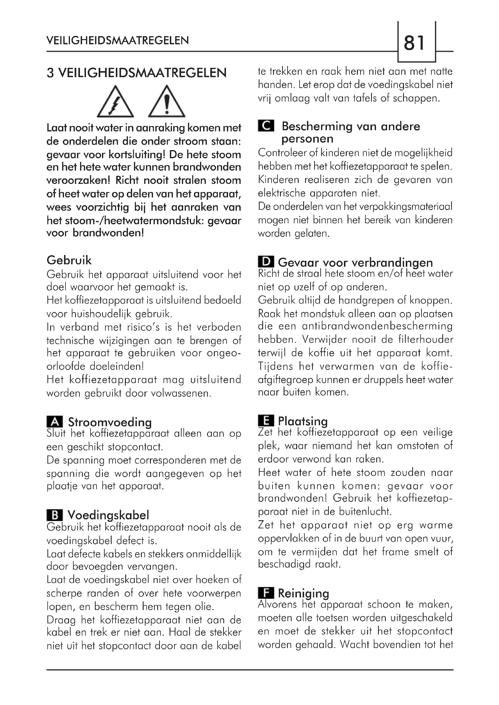 Elektriciteit kan gevaarlijk zijn! Houdt u zich daarom nauwgezet aan de veiligheidsvoorschriften. Gebruik nooit defecte kabels! Defecte kabels en stekkers moeten onmiddellijk worden vervangen door erkende vakspecialisten. Het koffiezetapparaat moet worden aangesloten op een geschikt stopcontact. De spanning van het apparaat is op de fabriek ingesteld. Controleer of de netspanning overeenkomt84