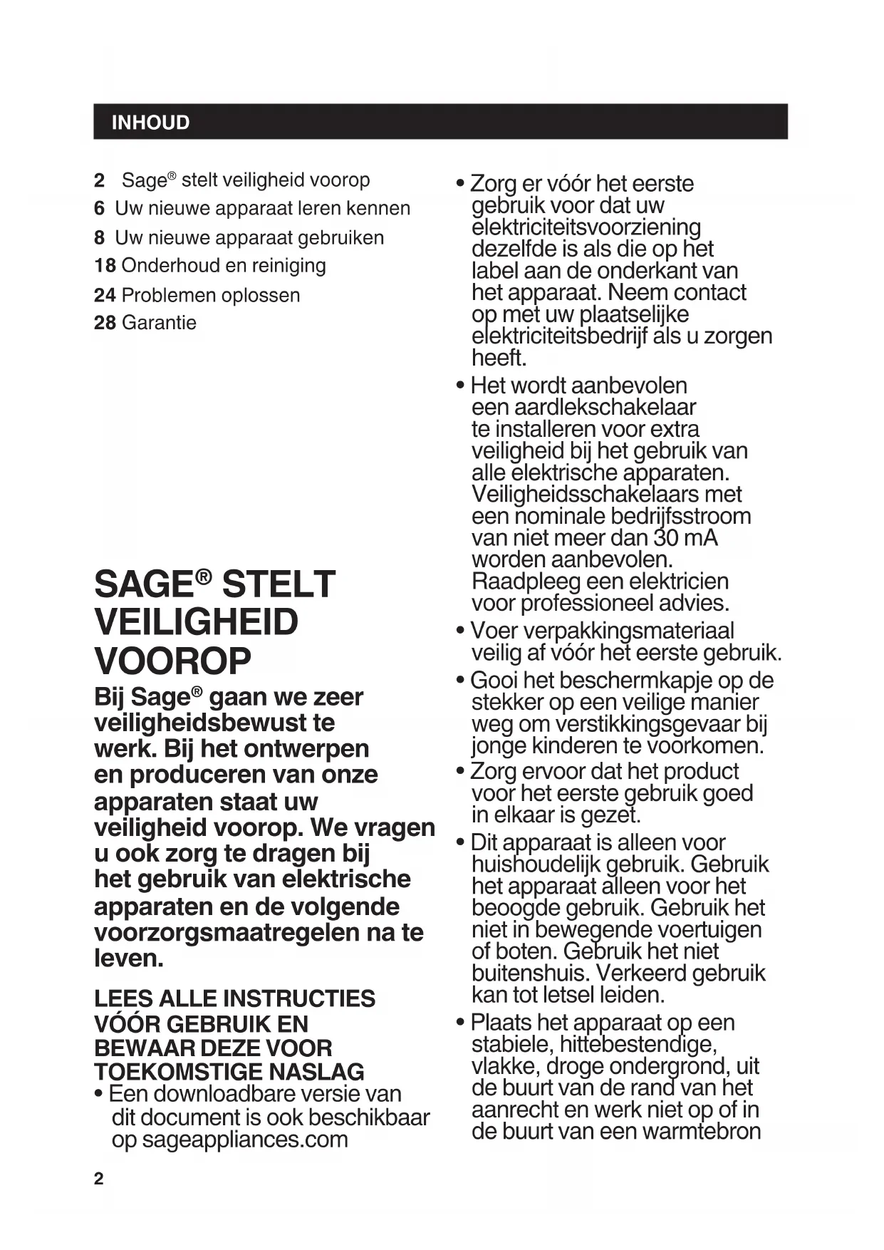 stelt veiligheid voorop 6 Uw nieuwe apparaat leren kennen 8 Uw nieuwe apparaat gebruiken 18 Onderhoud en reiniging 24 Problemen oplossen 28 Garantie SAGE