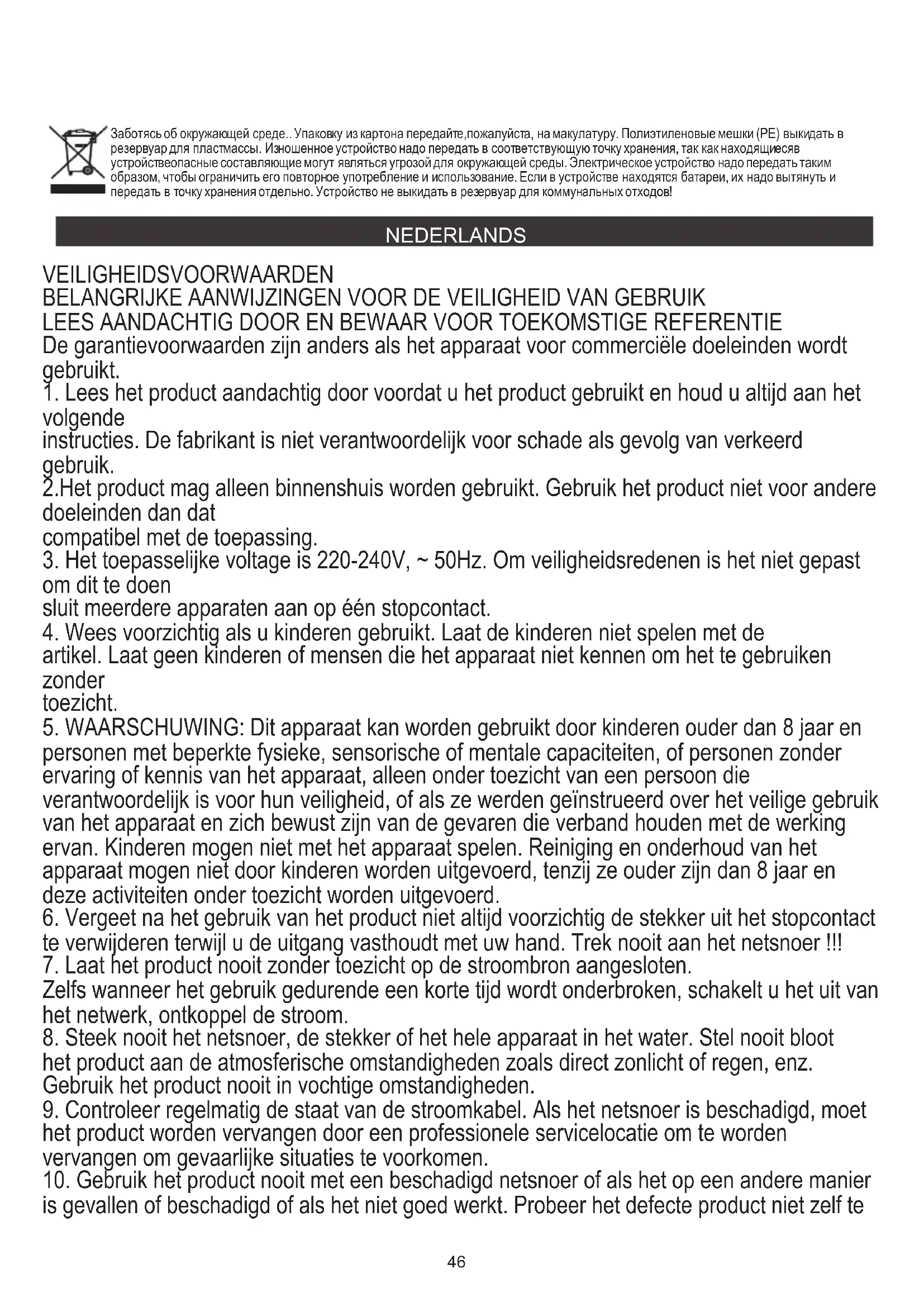 is gevallen of beschadigd of als het niet goed werkt. Probeer het defecte product niet zelf te NEDERLANDS47 repareren omdat dit tot een elektrische schok kan leiden. Schakel het beschadigde apparaat altijd naar een professionele servicelocatie om het te repareren. Alle reparaties kunnen alleen worden uitgevoerd door geautoriseerde serviceprofessionals. De reparatie die verkeerd is uitgevoerd, kan gevaarlijke situaties voor de gebruiker veroorzaken.