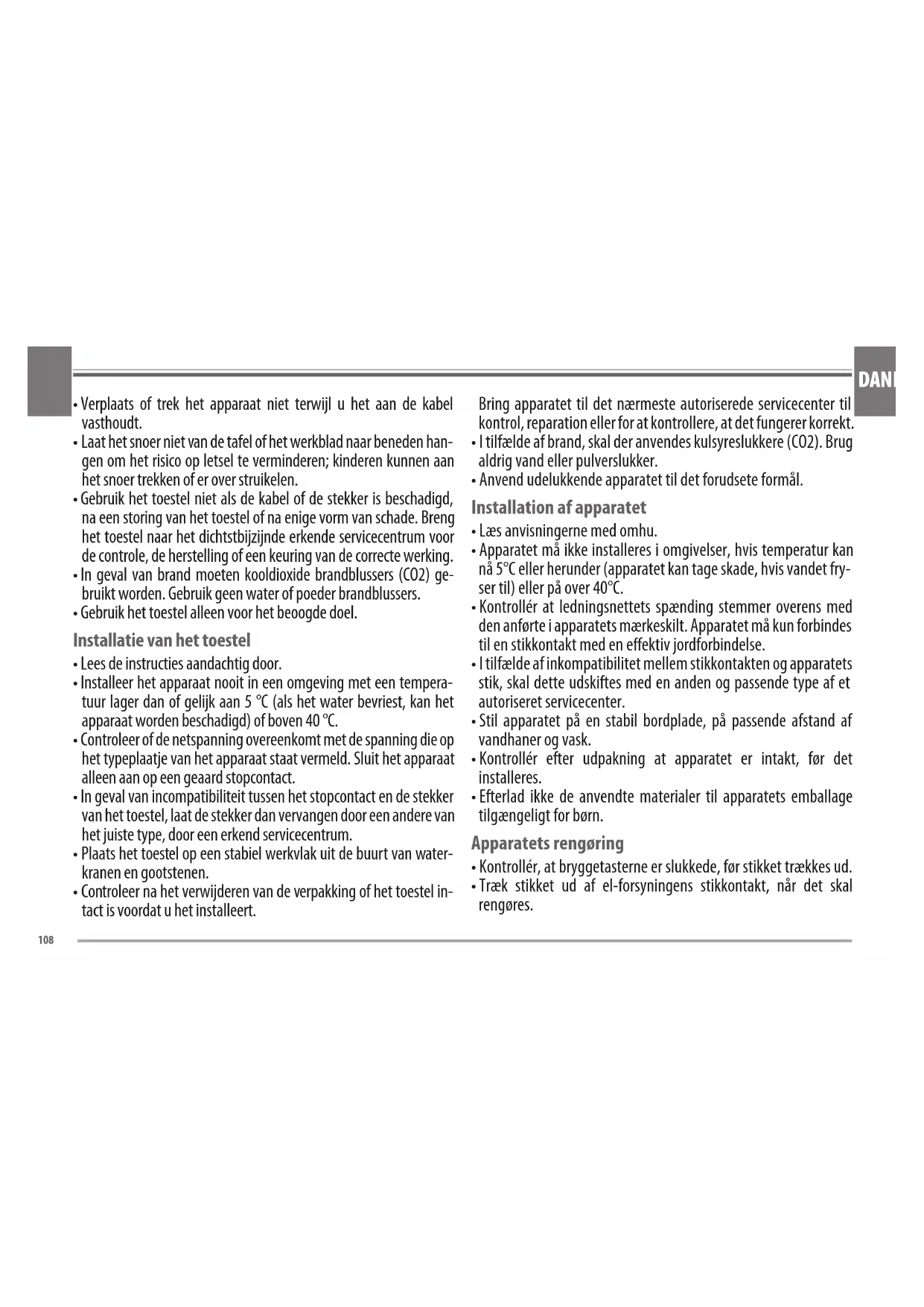 INSTRUCTIES. Oneigenlijk gebruik van het toestel De fabrikant kan niet aansprakelijk worden gesteld voor eventuele ongevallen die worden veroorzaakt door gebrek aan of het niet na- leven van de geldende wetten van het aardingssysteem. De fabrikant kan niet aansprakelijk gesteld worden voor eventuele schade door onjuist, verkeerd of onredelijk gebruik van het apparaat. I tilfælde af beskadigelse af apparatet