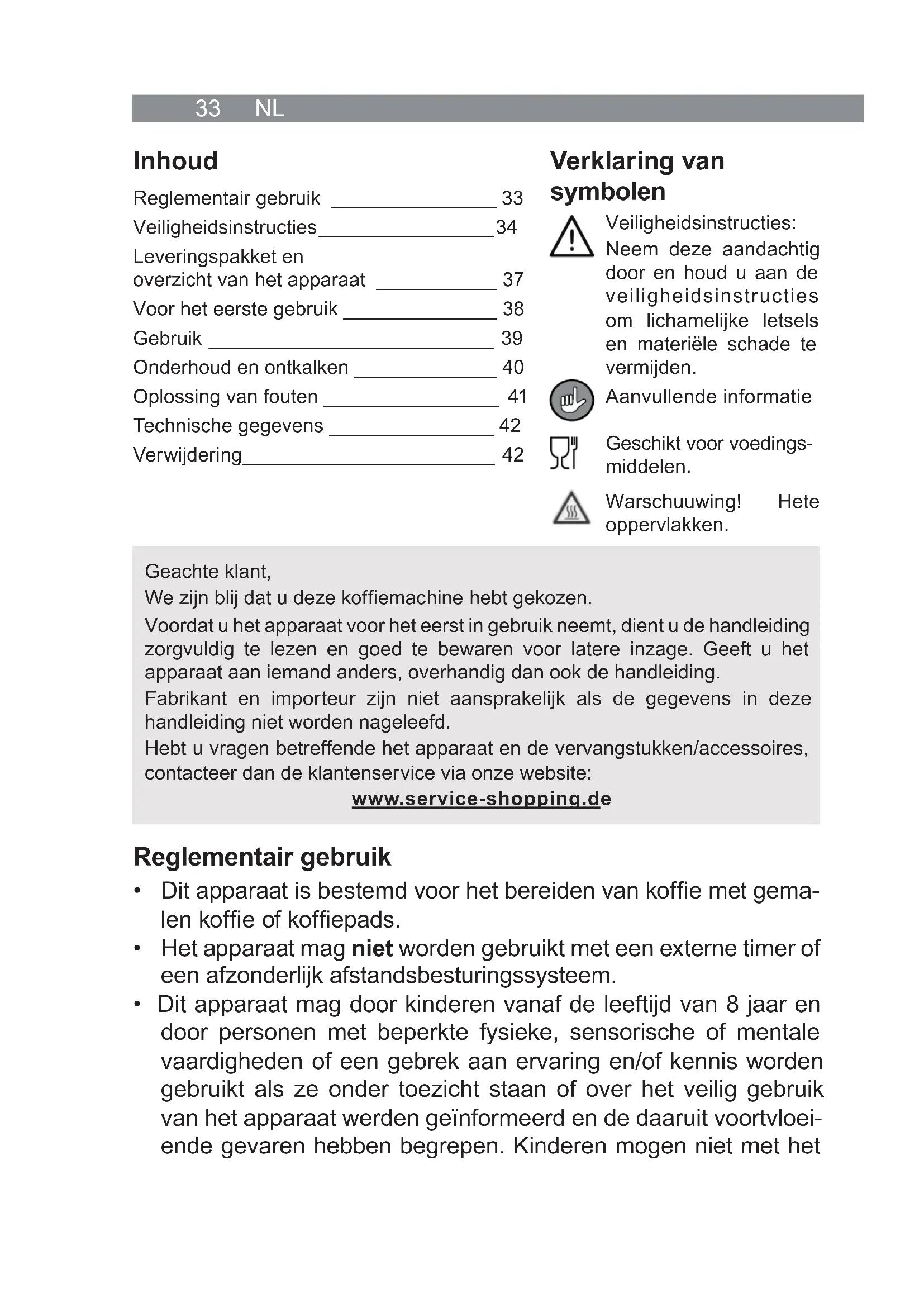 - Dit apparaat is bestemd voor het bereiden van koffie met gemalen koffie of koffiepads.