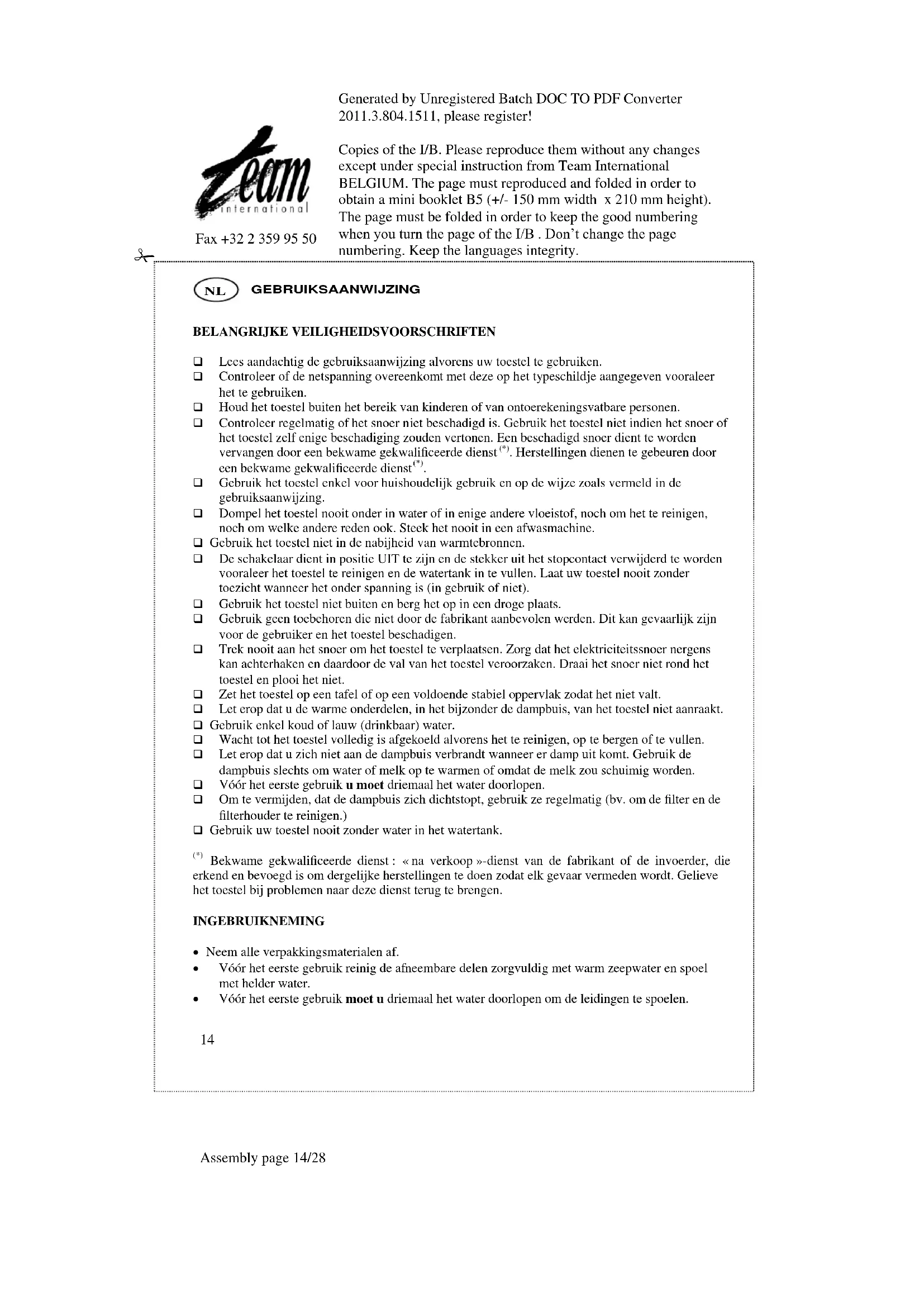 □ Controleer regelmatig of het snoer Niet beschadigd is. Gebruik het toestel Niet indien het snoer of het toestel zich enige beschadiging zonden vertonen. Een beschadigd snoer dien te worden verwangen door een bekwame gekwalificicerde dienst (^) . Herstellingen dienen te gebeuren dooreen bekwame gekwalificicerde dienst (^)