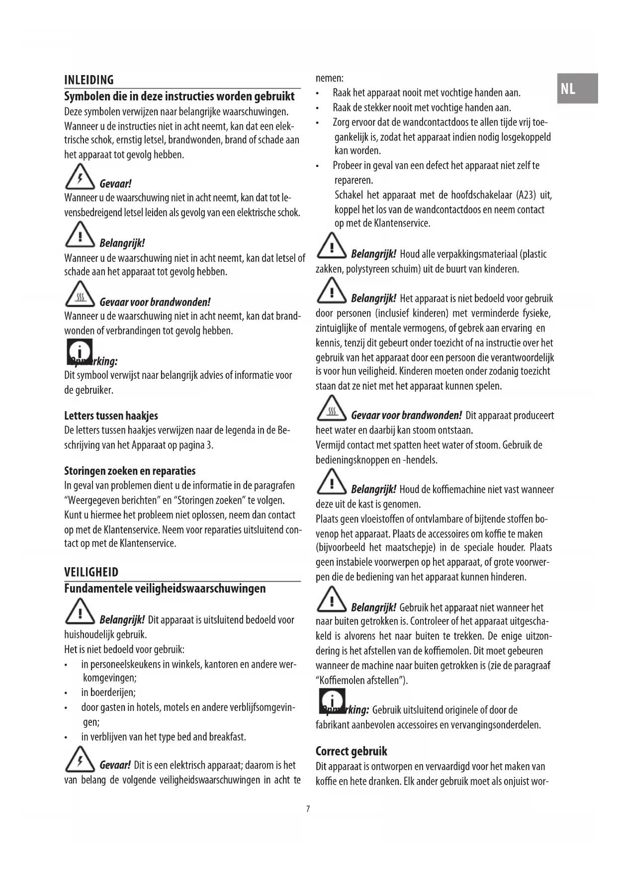 INLEIDING Symbolen die in deze instructies worden gebruikt Deze symbolen verwijzen naar belangrijke waarschuwingen. Wanneer u de instructies niet in acht neemt, kan dat een elek- trische schok, ernstig letsel, brandwonden, brand of schade aan het apparaat tot gevolg hebben. Gevaar! Wanneer u de waarschuwing niet in acht neemt, kan dat tot le- vensbedreigend letsel leiden als gevolg van een elektrische schok. Belangrijk! Wanneer u de waarschuwing niet in acht neemt, kan dat letsel of schade aan het apparaat tot gevolg hebben. Gevaar voor brandwonden! Wanneer u de waarschuwing niet in acht neemt, kan dat brand- wonden of verbrandingen tot gevolg hebben. Opmerking: Dit symbool verwijst naar belangrijk advies of informatie voor de gebruiker. Letters tussen haakjes De letters tussen haakjes verwijzen naar de legenda in de Be- schrijving van het Apparaat op pagina 3. Storingen zoeken en reparaties In geval van problemen dient u de informatie in de paragrafen “Weergegeven berichten” en “Storingen zoeken” te volgen. Kunt u hiermee het probleem niet oplossen, neem dan contact op met de Klantenservice. Neem voor reparaties uitsluitend con- tact op met de Klantenservice. VEILIGHEID Fundamentele veiligheidswaarschuwingen Belangrijk! Dit apparaat is uitsluitend bedoeld voor huishoudelijk gebruik. Het is niet bedoeld voor gebruik: