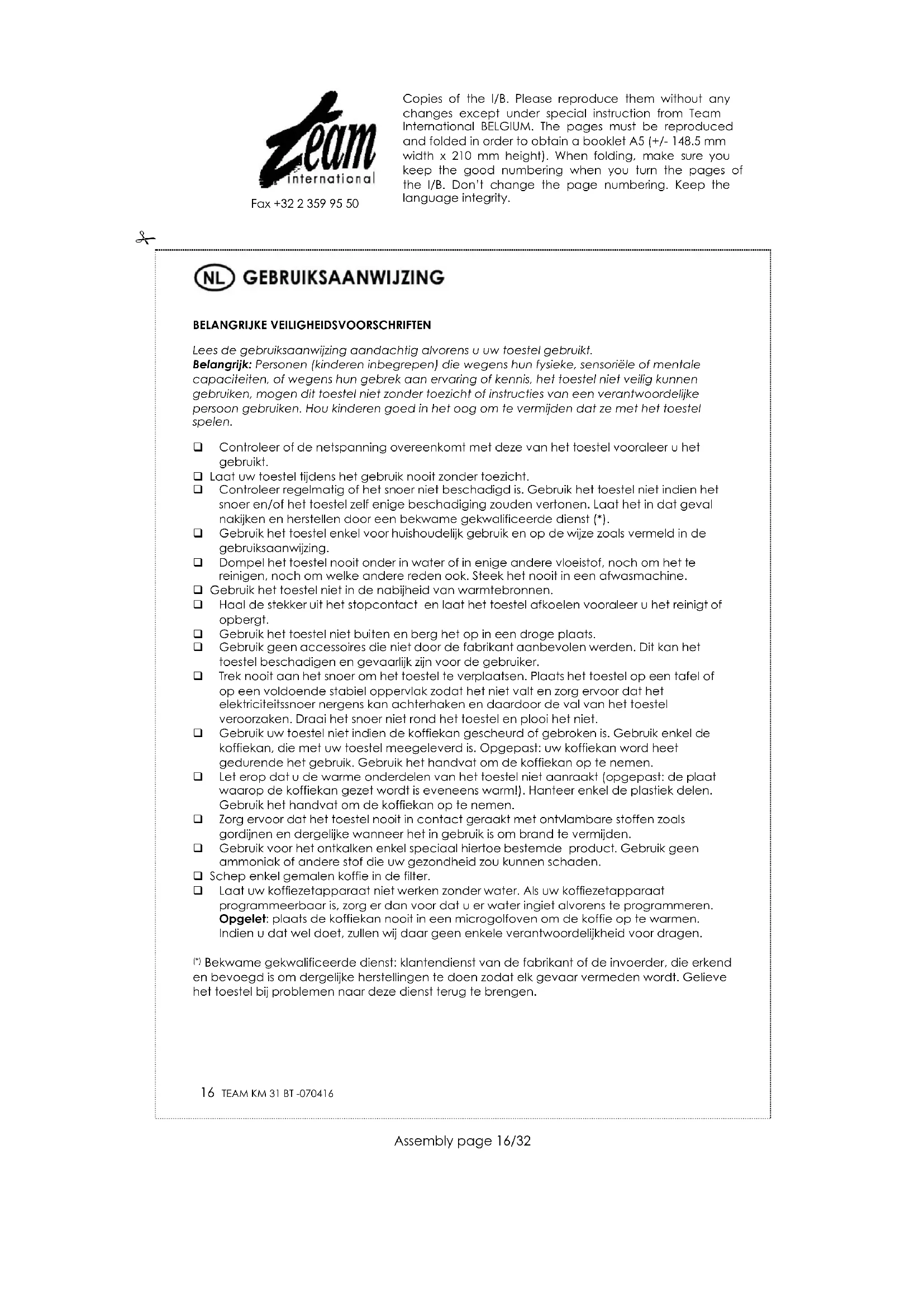 GEBRUIKSAANWIJZING KM 31 BT TEAM