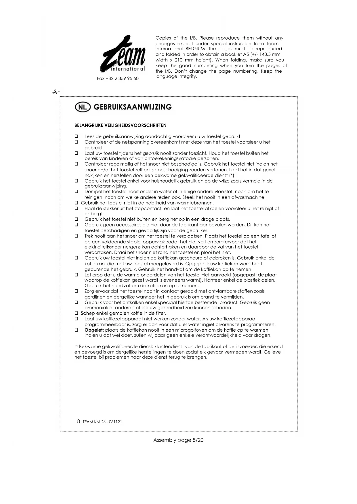 Om ons milieu en onze gezondheid te beschermen, moet afgedankte elektrische en elektronische apparatuur in overeenstemming met welbepaalde regels weggegooid worden. Dit vergt zowel de inzet van de leveranciers als van de gebruikers. Om deze reden mag uw apparaat, zoals op het typeplaatje of op de verpakking aangegeven door het symbool , niet met het gewone huisvuil weggegooid worden. De gebruiker heeft het recht het toestel naar een gemeentelijk centrum van gescheiden inzameling te brengen waar het overeenkomstig de richtlijn hergebruikt, gerecycleerd of voor andere doeleinden gebruikt zal worden. Copies of the I/B. Please reproduce them without any changes except under special instruction from Team International BELGIUM. The pages must be reproduced and folded in order to obtain a booklet A5 (+/- 148.5 mm width x 210 mm height). When folding, make sure you keep the good numbering when you turn the pages of the I/B. Don’t change the page numbering. Keep the language integrity.