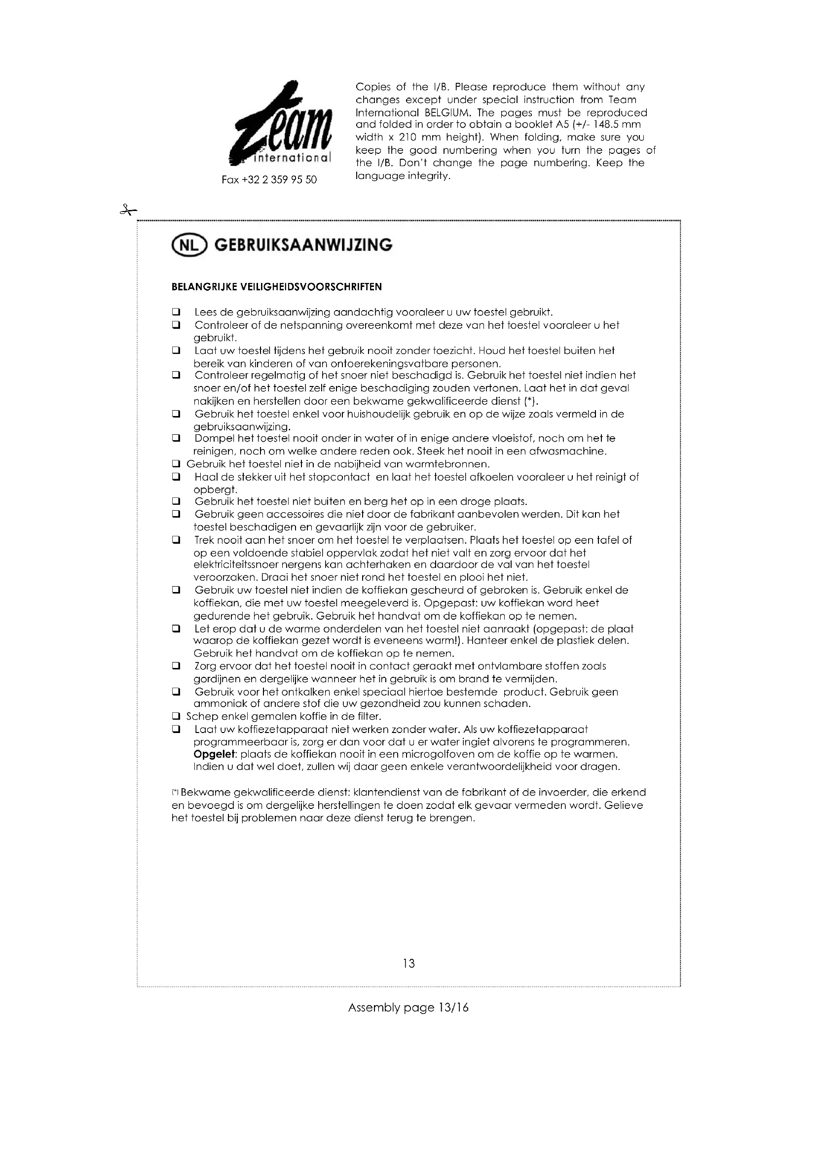 Wij raden U aan het apparaat regelmatig te ontkalken. Dit verlengt de levensduur van het apparaat. Om de frequentie van het ontkalken te bepalen, controleer de hardheid van uw water, wat betekent zijn mineraalgehalte. Gebruik hiervoor de in de handel zijnde ontkalkingmiddelen. We zullen niet verantwoordelijk zijn voor de herstellingen die met een slechte onderhoud van uw toestel verbonden zijn. Op de garantie kan geen aanspraak gemaakt worden voor de vervanging van een verwarmingselement met kalkaanslag. Gebruik geen vaatwasmachine om de kan te reinigen. Reinig de plastiek delen met een vochtige doek. De filterhouder van uw koffiezetapparaat is afneembaar. Daarmee kunt u deze gemakkelijker reinigen (bv. Bij het afspoelen onder een waterstraal). Trek deze omhoog. Om de verwarmingsplaat te reinigen gebruikt men een niet-schurende spons om krassen te vermijden. Om de kan te reinigen, gebruik een klassiek afwasmiddel en een spons (vermijd te schurende sponsen), dan spoel met zuiver water. Copies of the I/B. Please reproduce them without any changes except under special instruction from Team International BELGIUM. The pages must be reproduced and folded in order to obtain a booklet A5 (+/- 148.5 mm width x 210 mm height). When folding, make sure you keep the good numbering when you turn the pages of the I/B. Don’t change the page numbering. Keep the language integrity.
