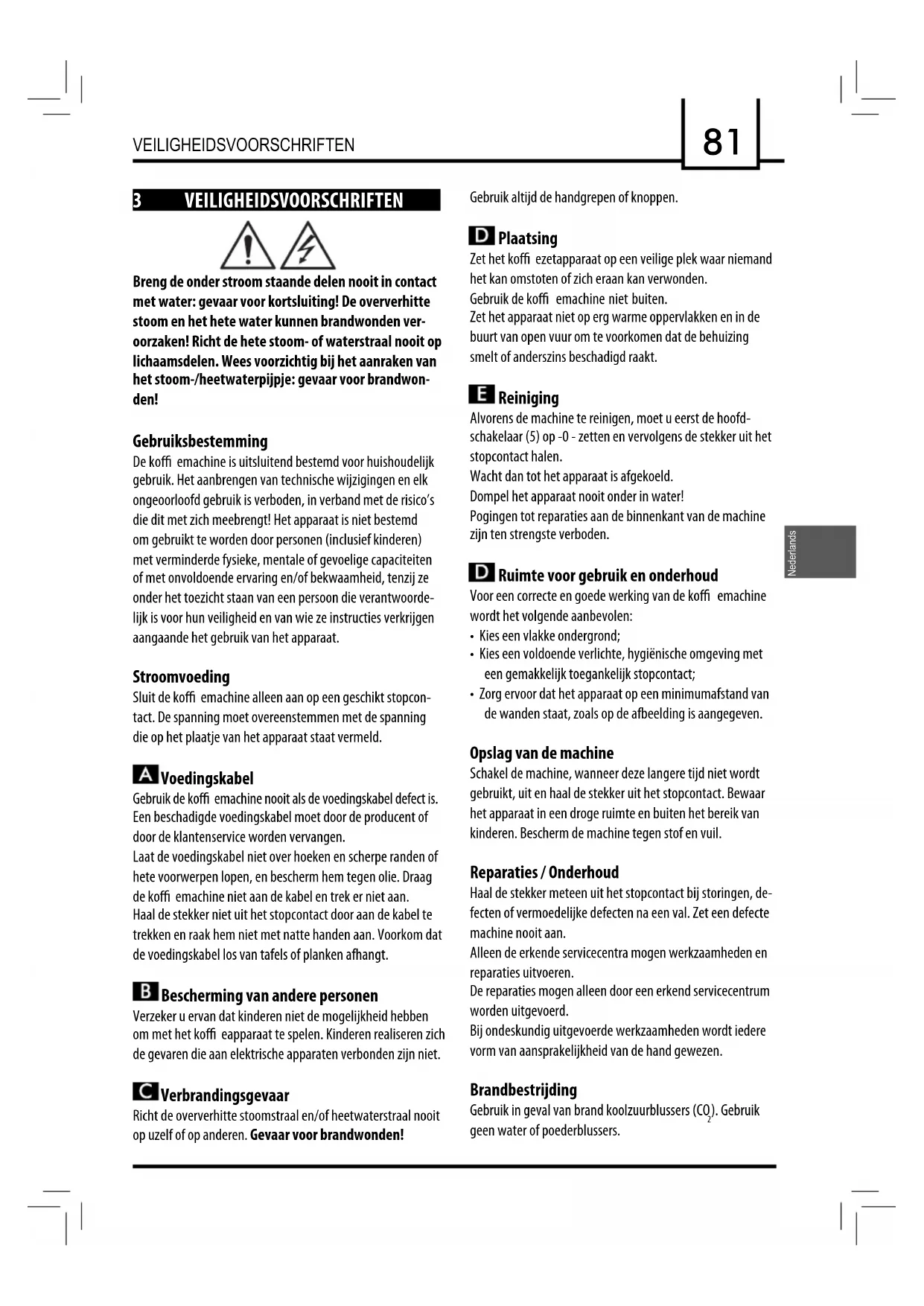 - Veiligheidsinrichtingen Veiligheidsventiel waterketeldruk Veiligheidsthermostaat Met voorbehoud van wijzigingen in de constructie en uitvoering op basis van de technologische vooruit- gang.80 Afstanden in mm O I L VEILIGHEIDSVOORSCHRIFTEN81 Nederlands 3 VEILIGHEIDSVOORSCHRIFTEN Breng de onder stroom staande delen nooit in contact met water: gevaar voor kortsluiting! De oververhitte stoom en het hete water kunnen brandwonden ver- oorzaken! Richt de hete stoom- of waterstraal nooit op lichaamsdelen. Wees voorzichtig bij het aanraken van het stoom-/heetwaterpijpje: gevaar voor brandwon- den! Gebruiksbestemming De ko emachine is uitsluitend bestemd voor huishoudelijk gebruik. Het aanbrengen van technische wijzigingen en elk ongeoorloofd gebruik is verboden, in verband met de risico’s die dit met zich meebrengt! Het apparaat is niet bestemd om gebruikt te worden door personen (inclusief kinderen) met verminderde fysieke, mentale of gevoelige capaciteiten of met onvoldoende ervaring en/of bekwaamheid, tenzij ze onder het toezicht staan van een persoon die verantwoorde- lijk is voor hun veiligheid en van wie ze instructies verkrijgen aangaande het gebruik van het apparaat. Stroomvoeding Sluit de ko emachine alleen aan op een geschikt stopcon- tact. De spanning moet overeenstemmen met de spanning die op het plaatje van het apparaat staat vermeld. Voedingskabel Gebruik de ko emachine nooit als de voedingskabel defect is. Een beschadigde voedingskabel moet door de producent of door de klantenservice worden vervangen. Laat de voedingskabel niet over hoeken en scherpe randen of hete voorwerpen lopen, en bescherm hem tegen olie. Draag de ko emachine niet aan de kabel en trek er niet aan. Haal de stekker niet uit het stopcontact door aan de kabel te trekken en raak hem niet met natte handen aan. Voorkom dat de voedingskabel los van tafels of planken afhangt. Bescherming van andere personen Verzeker u ervan dat kinderen niet de mogelijkheid hebben om met het ko eapparaat te spelen. Kinderen realiseren zich de gevaren die aan elektrische apparaten verbonden zijn niet. Verbrandingsgevaar Richt de oververhitte stoomstraal en/of heetwaterstraal nooit op uzelf of op anderen. Gevaar voor brandwonden! VEILIGHEIDSVOORSCHRIFTEN Gebruik altijd de handgrepen of knoppen. Plaatsing Zet het ko ezetapparaat op een veilige plek waar niemand het kan omstoten of zich eraan kan verwonden. Gebruik de ko emachine niet buiten. Zet het apparaat niet op erg warme oppervlakken en in de buurt van open vuur om te voorkomen dat de behuizing smelt of anderszins beschadigd raakt. Reiniging Alvorens de machine te reinigen, moet u eerst de hoofd- schakelaar (5) op -0 - zetten en vervolgens de stekker uit het stopcontact halen. Wacht dan tot het apparaat is afgekoeld. Dompel het apparaat nooit onder in water! Pogingen tot reparaties aan de binnenkant van de machine zijn ten strengste verboden. Ruimte voor gebruik en onderhoud Voor een correcte en goede werking van de ko emachine wordt het volgende aanbevolen: