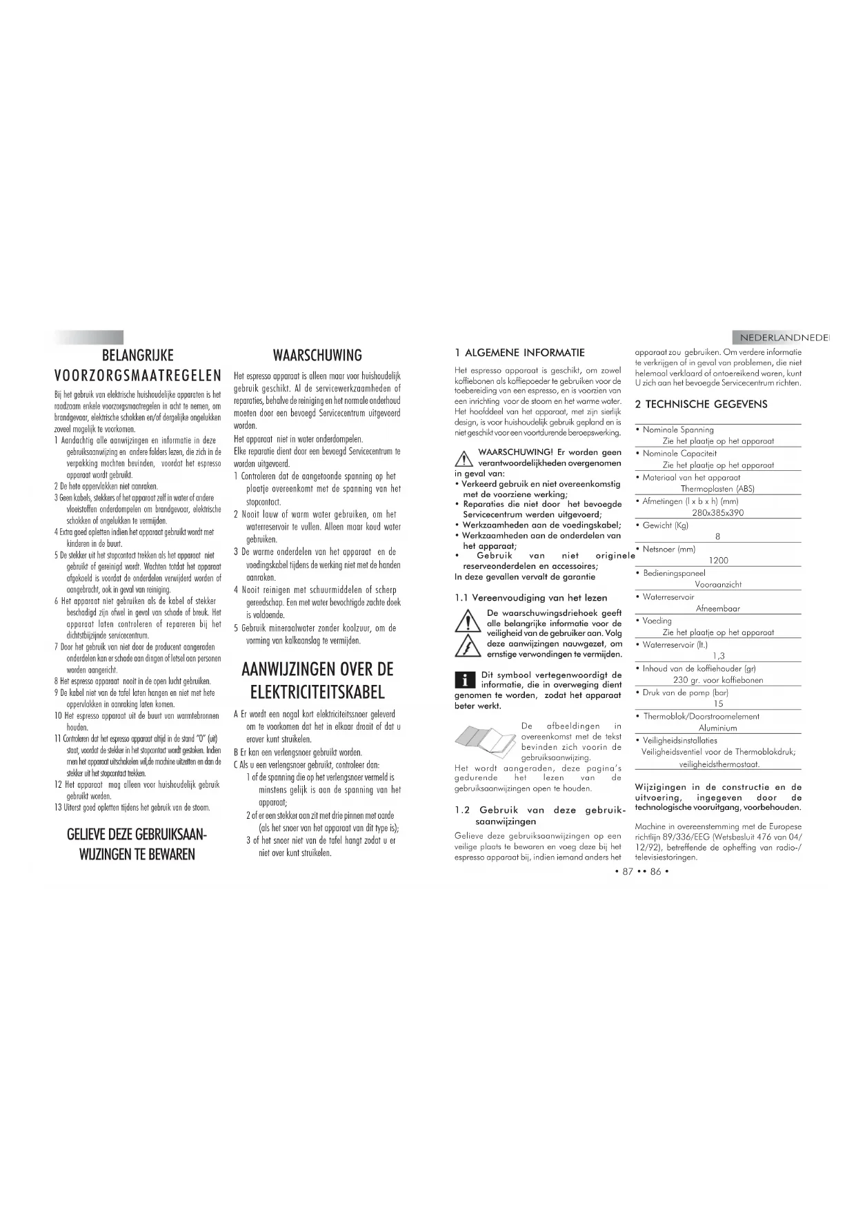 - 87 •• 86 • BELANGRIJKE VOORZORGSMAATREGELEN Bij het gebruik van elektrische huishoudelijke apparaten is het raadzaam enkele voorzorgsmaatregelen in acht te nemen, om brandgevaar, elektrische schokken en/of dergelijke ongelukken zoveel mogelijk te voorkomen. 1 Aandachtig alle aanwijzingen en informatie in deze gebruiksaanwijzing en andere folders lezen, die zich in de verpakking mochten bevinden, voordat het espresso apparaat wordt gebruikt. 2 De hete oppervlakken niet aanraken. 3 Geen kabels, stekkers of het apparaat zelf in water of andere vloeistoffen onderdompelen om brandgevaar, elektrische schokken of ongelukken te vermijden. 4 Extra goed opletten indien het apparaat gebruikt wordt met kinderen in de buurt. 5 De stekker uit het stopcontact trekken als het apparaat niet gebruikt of gereinigd wordt. Wachten totdat het apparaat afgekoeld is voordat de onderdelen verwijderd worden of aangebracht, ook in geval van reiniging. 6 Het apparaat niet gebruiken als de kabel of stekker beschadigd zijn ofwel in geval van schade of breuk. Het apparaat laten controleren of repareren bij het dichtstbijzijnde servicecentrum. 7 Door het gebruik van niet door de producent aangeraden onderdelen kan er schade aan dingen of letsel aan personen worden aangericht. 8 Het espresso apparaat nooit in de open lucht gebruiken. 9 De kabel niet van de tafel laten hangen en niet met hete oppervlakken in aanraking laten komen. 10 Het espresso apparaat uit de buurt van warmtebronnen houden. 11 Controleren dat het espresso apparaat altijd in de stand “0” (uit) staat, voordat de stekker in het stopcontact wordt gestoken. Indien men het apparaat uitschakelen wil,de machine uitzetten en dan de stekker uit het stopcontact trekken. 12 Het apparaat mag alleen voor huishoudelijk gebruik gebruikt worden. 13 Uiterst goed opletten tijdens het gebruik van de stoom.