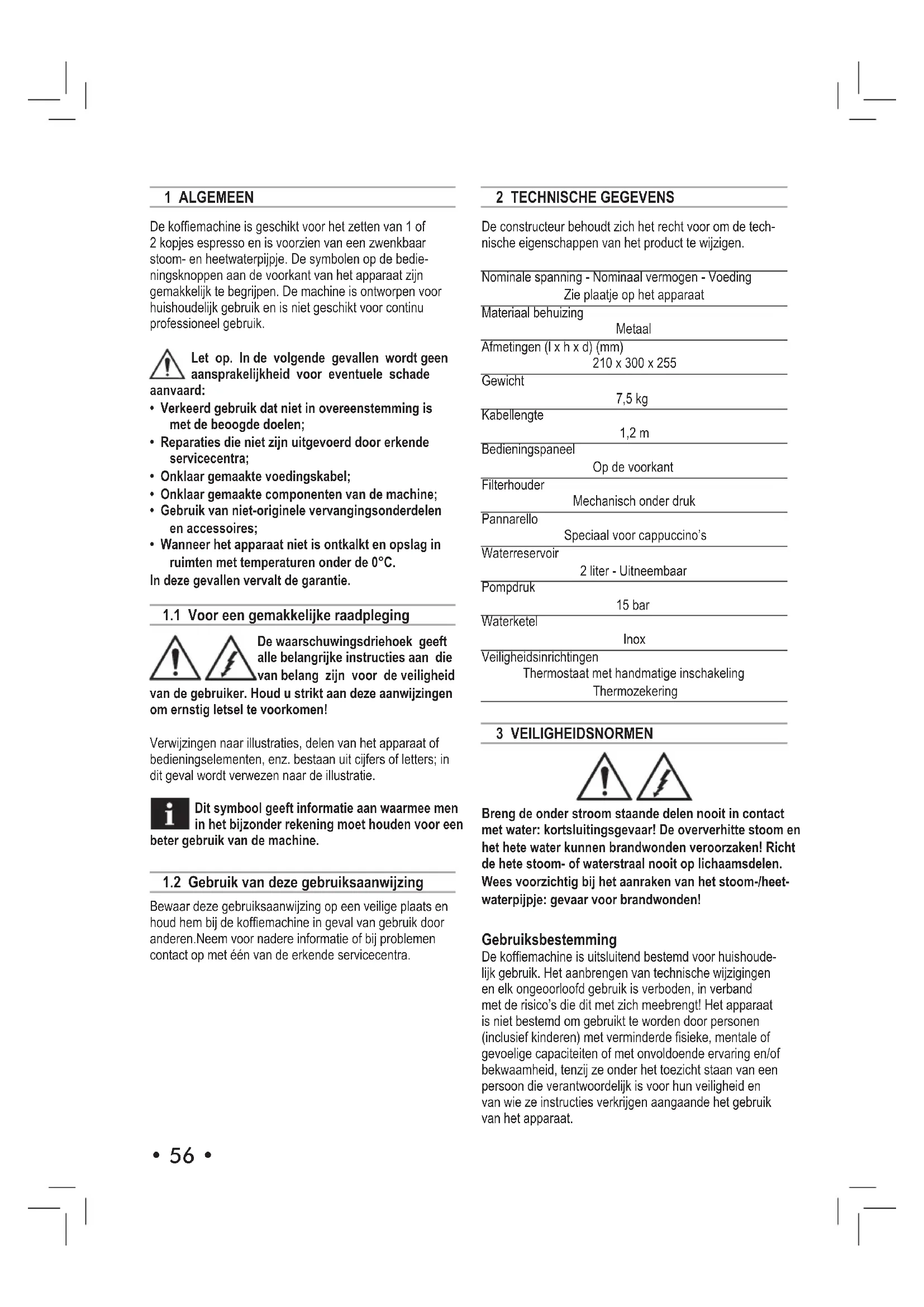 anderen.Neem voor nadere informatie of bij problemen contact op met één van de erkende servicecentra. 2 TECHNISCHE GEGEVENS De constructeur behoudt zich het recht voor om de tech- nische eigenschappen van het product te wijzigen. Nominale spanning - Nominaal vermogen - Voeding Zie plaatje op het apparaat Materiaal behuizing Metaal Afmetingen (l x h x d) (mm) 210 x 300 x 255 Gewicht 7,5 kg Kabellengte 1,2 m Bedieningspaneel Op de voorkant Filterhouder Mechanisch onder druk Pannarello Speciaal voor cappuccino’s Waterreservoir 2 liter - Uitneembaar Pompdruk 15 bar Waterketel Inox Veiligheidsinrichtingen Thermostaat met handmatige inschakeling Thermozekering 3 VEILIGHEIDSNORMEN Breng de onder stroom staande delen nooit in contact met water: kortsluitingsgevaar! De oververhitte stoom en het hete water kunnen brandwonden veroorzaken! Richt de hete stoom- of waterstraal nooit op lichaamsdelen. Wees voorzichtig bij het aanraken van het stoom-/heet- waterpijpje: gevaar voor brandwonden! Gebruiksbestemming