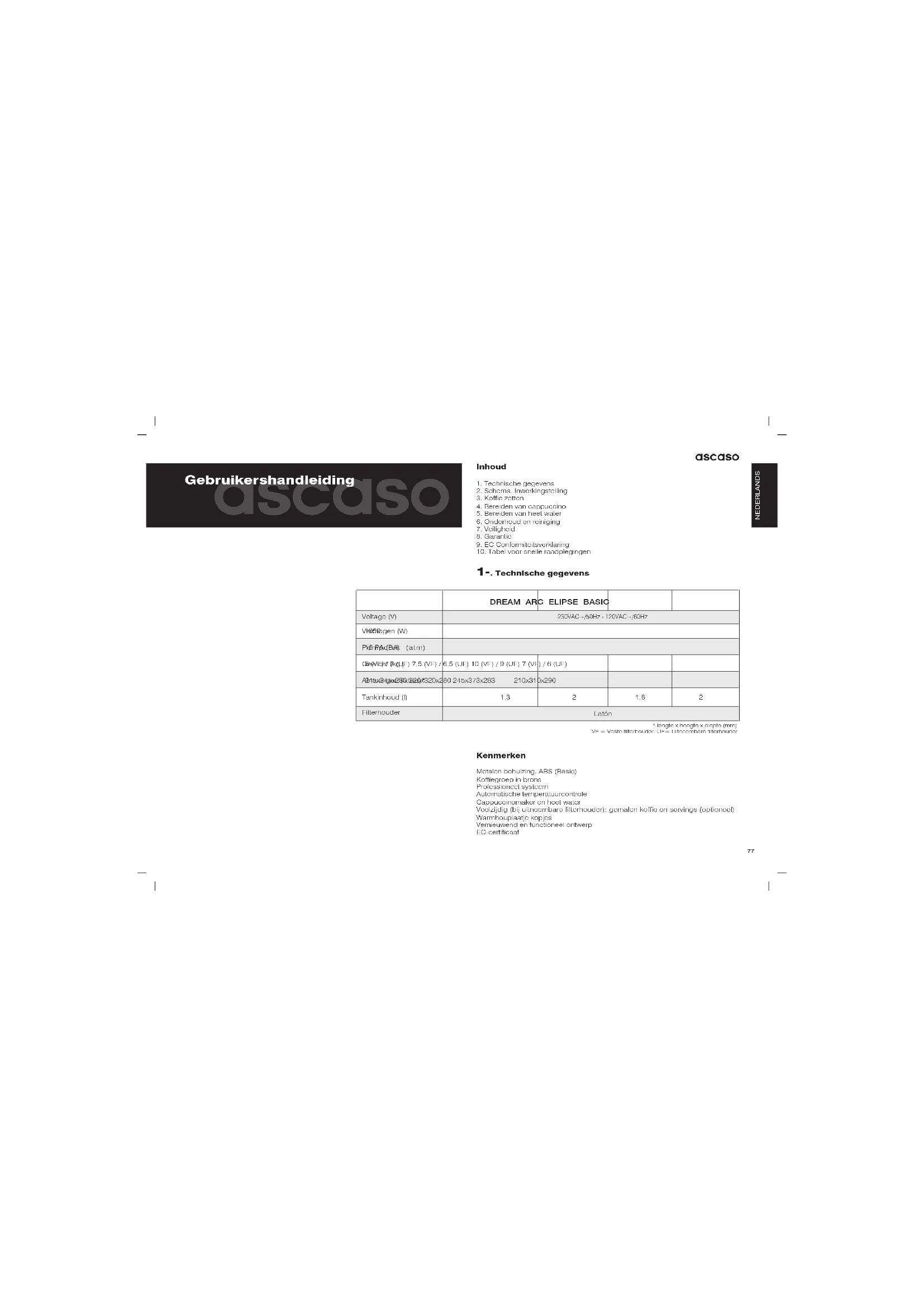 De garantie bestaat uit de factuur zelf. Bewaar deze zorgvuldig. U dient deze in geval van storing te overhandigen aan de Reparatiedienst. De leverancier garandeert dit apparaat vanaf de aankoopdatum tegen alle fabrieksfouten of fouten in het gebruikte materiaal. Eventuele vervoers- en verpakkingskosten zijn voor rekening van de gebruiker. Deze garantie is ongeldig: 1 .Indien u niet over de factuur beschikt. 2 .Indien de machine op onjuiste wijze is gebruikt 3 .Bij ophoping van kalk of gebrekkige reiniging van de machine 4 .Indien het apparaat uit elkaar is gehaald door personen die niet zijn aangesloten bij het Netwerk van Officiële Technische Dienstverlening van Ascaso. 9.Conformiteitsverklaring ASCASO FACTORY S.L, verklaart dat het in deze verklaring vermelde product, Espressoapparaat, voldoet aan de vereisten van de Richtlijn van 14 juni 1989 inzake de onderlinge aanpassing van de wetgevingen van de lidstaten betreffende machines (89/392/EEG), elektrisch materiaal (73/23/EEG) en elektromagnetische compatibiliteit (89/396/EEG). ascaso ascaso
