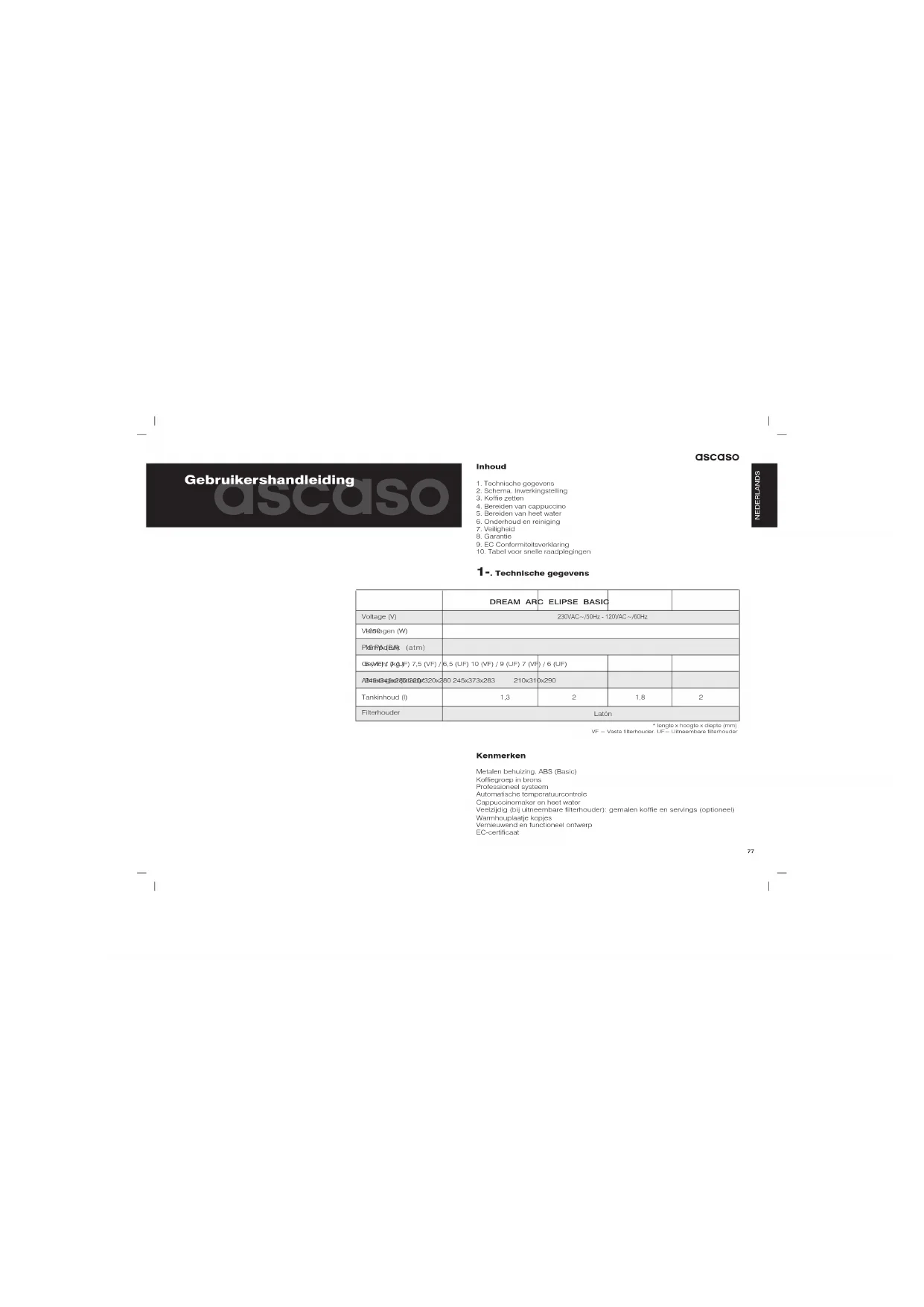 16 PA (BA) 8 (VF) / 7 (UF) 7,5 (VF) / 6,5 (UF) 10 (VF) / 9 (UF) 7 (VF) / 6 (UF) 245x345x280 220x320x280 245x373x283 210x310x290 1,3 2 1,8 2 Latón Voltage (V) Vermogen (W) Pompdruk (atm) Gewicht (kg.) Afmetingen (lxhxd)* Tankinhoud (l) Filterhouder NEDERLANDS2-. Inwerkingstelling Aan/uit-knop Koffieschakelaar Stoomschakelaar Knop voor stoom/water Stoom-/waterpijpje Temperatuurlampje Beweegbare filterhouder (gemalen koffie) Koffiegroep (let op! Heet oppervlak) Warmhoudplaatje kopjes (Let op! Heet oppervlak) Beweegbare filter (alleen optie voor servings) Lekrooster Waarschuwingslampje stoom (Dream) Waarschuwingslampje aan/uit (Dream) Thermometer koffie/stoom (Dream) Koffiestamper Koffielepel ascaso ascaso