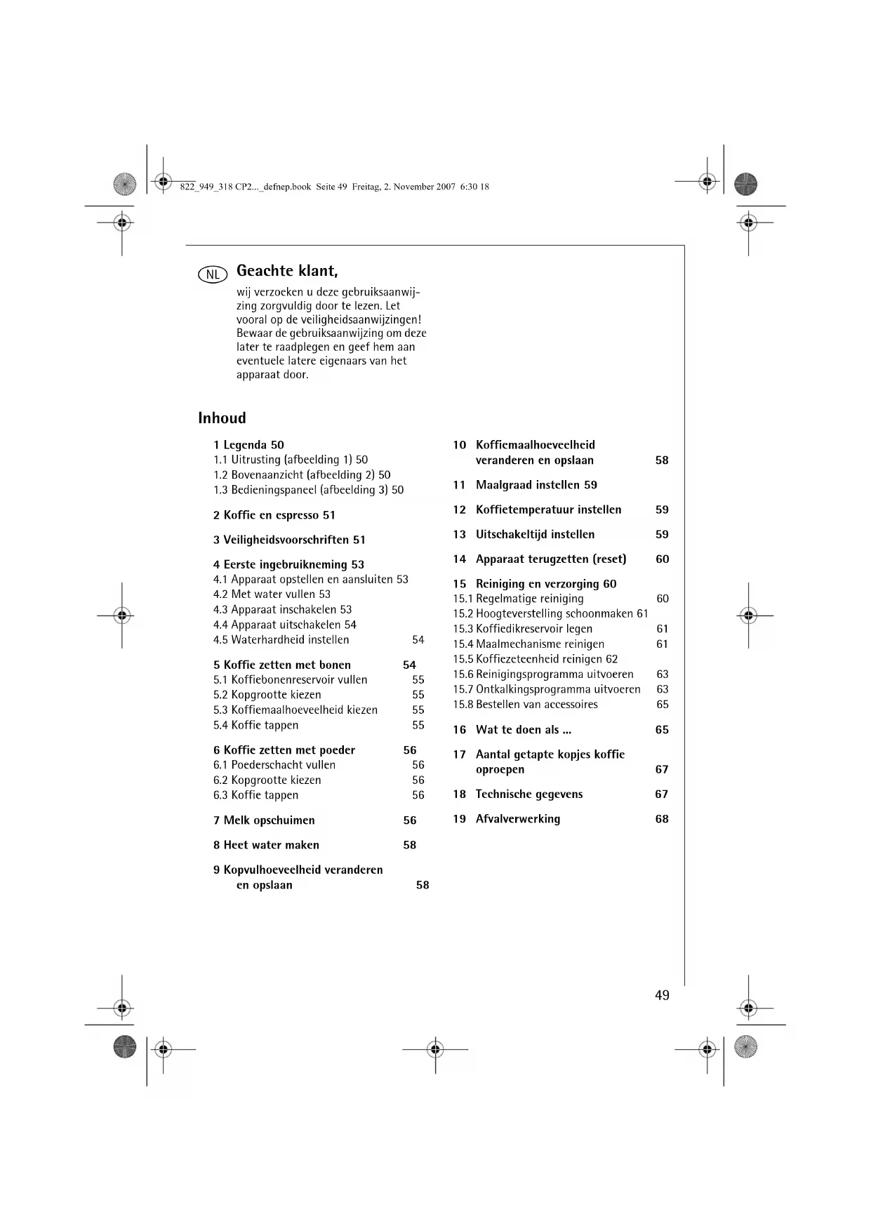 2 Koffie en espresso 51 3 Veiligheidsvoorschriften 51 4 Eerste ingebruikneming 53