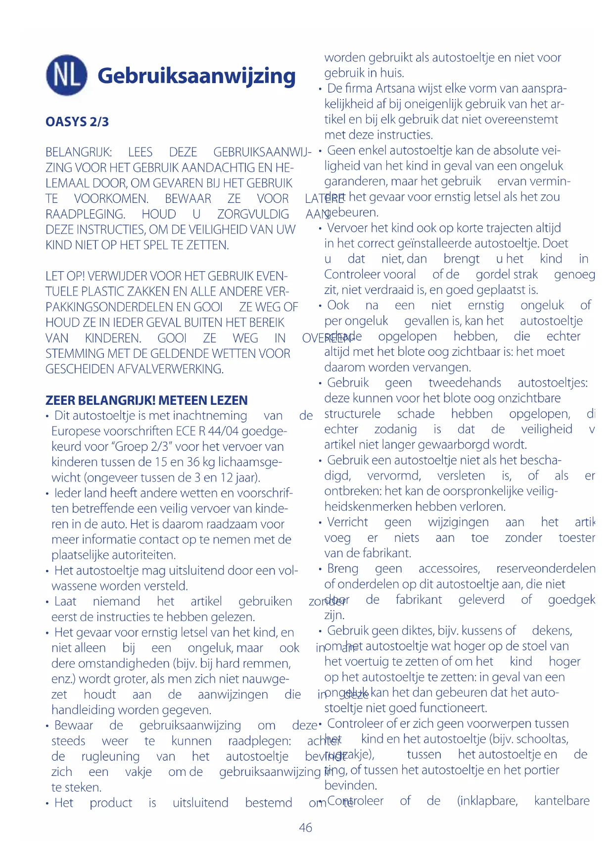 - plastic delen: controleer de slijtagestaat van alleplasticdelen,diegeenduidelijkebescha- digingenofverkleuringmogenhebben. LET OP! Indien het autostoeltje beschadigd, vervormdofernstigversletenmochtzijn,moet hetwordenvervangen: het kandeoorspron- kelijkeveiligheidskenmerkenhebbenverloren. Het artikel opbergen Alshetniet in de auto geïnstalleerd is, wordt aangeraden het autostoeltje op een droge plaats, uit de buurt van warmtebronnen en beschermd tegen stof, vocht en rechtstreeks zonlichttebewaren. Het product afdanken Als de voorziene gebruiksgrens van het au- tostoeltjeisbereikt,gebruiktuhetnietmeer enzetuhetbijhetafval.Uitrespectvoorhet milieuscheidtudeverschillendesoortenafval volgenswatdoordegeldendevoorschriftenin uwlandisvoorgeschreven. GARANTIE Het product valt onder garantie tegen elke non-conformiteit binnen de normale ge- bruiksomstandigheden zoals voorzien in de gebruiksaanwijzingen. De garantie is dus niet geldig in geval van schade veroorzaakt door oneigenlijk gebruik, slijtageoftoevalligegebeurtenissen. Voor de duur van de garantie inzake non- conformiteit verwijzen we naar de specieke richtlijnen en de nationale normen die van toepassingzijninhetlandvanaankoop,indien dezevoorzienzijn. 30° C52 Kullanim bilgileri OASYS 2/3